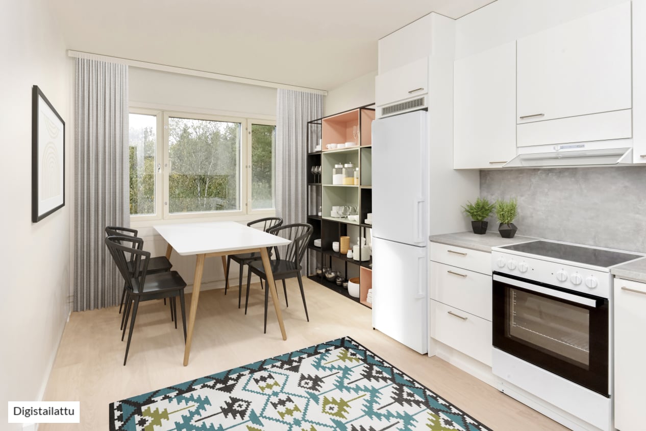 Remontoidun, tilavan kaksion ikkunat aukeavat talon molemmille puolille ja tuovat luonnonvalon osaksi sisustusta. Avaran olohuoneen jatkona on länteen suuntautuva lasitettu parveke, jossa kelpaa nauttia kesäilloista. Kodin pintamateriaalit ovat vaaleita ja pelkistetyn yksinkertaisia. Lattiat ovat vaaleaa tammilaminaattia ja seinät on maalattu valkoisiksi. Kotikokkailulle löydät mukavasti tilaa erillisestä keittiöstä, jossa mahtuu myös ruokailemaan. Keittiön kaapistot ovat valkoiset. Ylä- ja alakaappien välinen tila ja työtaso ovat harmaata laminaattia. Varustukseen kuuluu keraaminen liesi, liesikupu ja jääkaappipakastin. Kodinkoneet ovat valkoisia. Kylpyhuoneessa on valkoiset SATOn Kide-malliston kalusteet. Seinät ovat valkoista laattaa ja lattia on harmaa. Pyykinpesukoneelle on varaus.