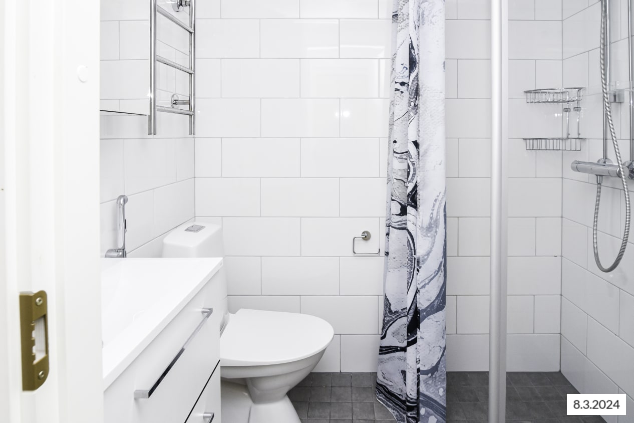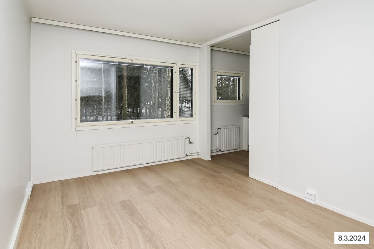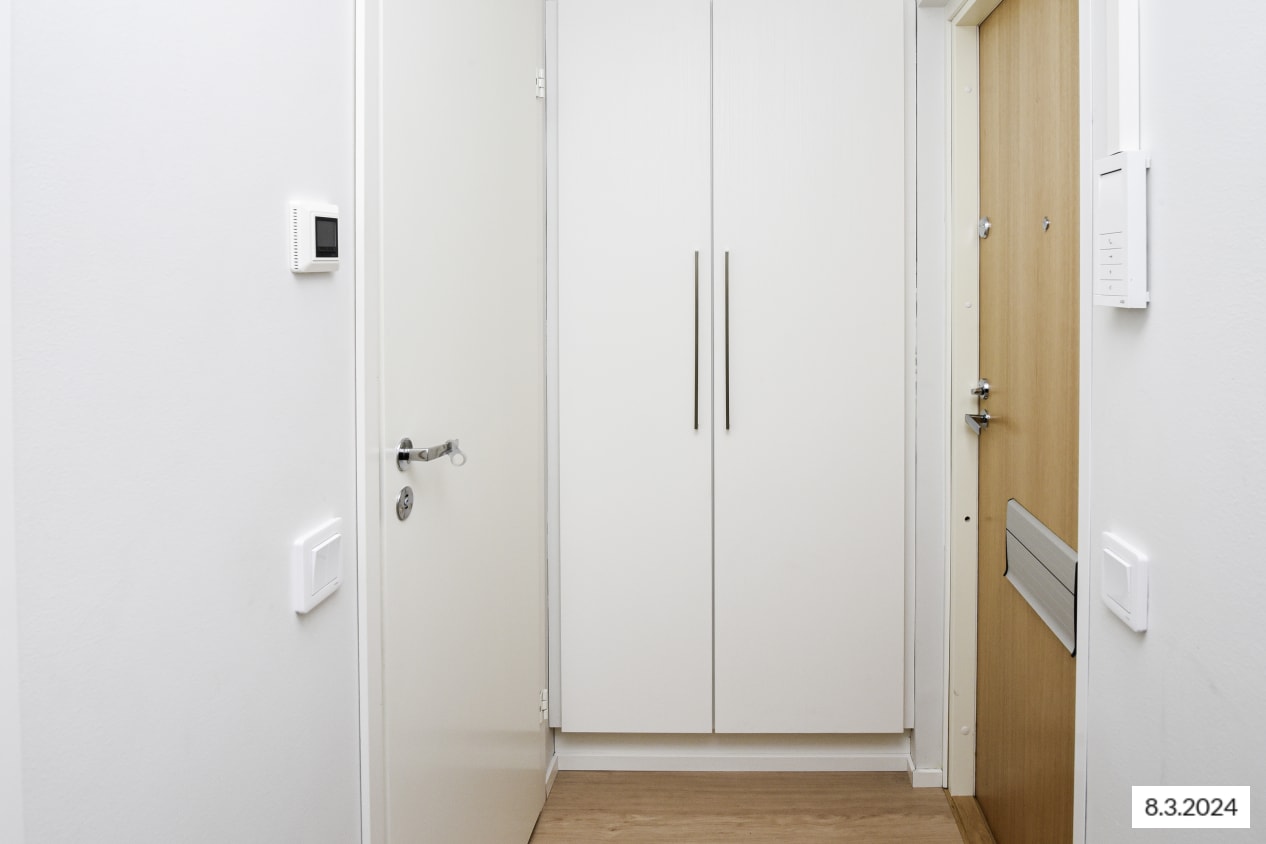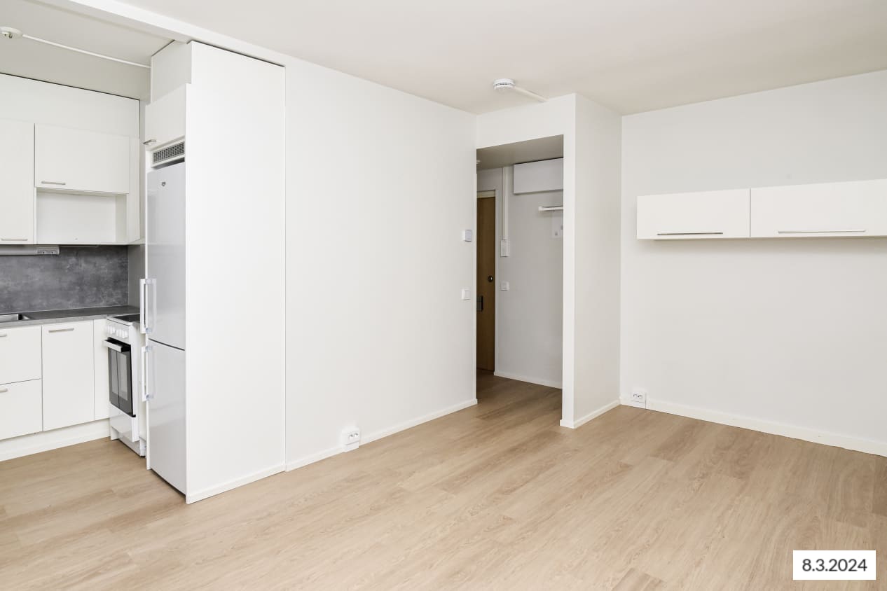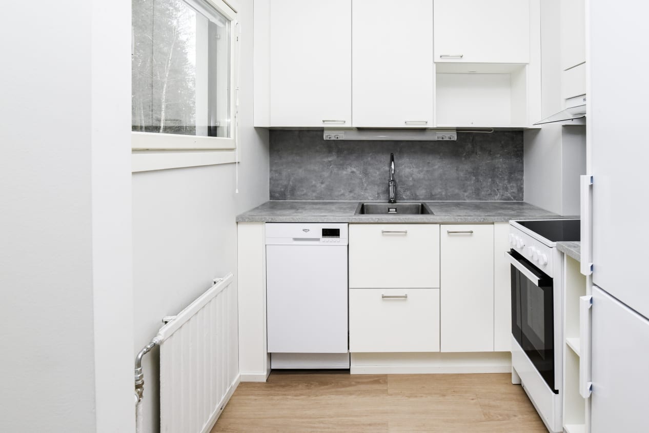Remontoitu, sympaattinen yksiö saa neliöitään avaramman tunnelmansa isosta ikkunasta, joka avautuu vehreän takapihan puolelle. Kodin pintamateriaalit ovat vaaleita ja pelkistetyn yksinkertaisia. Lattia on vaaleaa tammilaminaattia ja seinät on maalattu valkoisiksi. Keittiötilaan valoa tulee hauskasta pikkuikkunasta. Linjakkaat kaapistot ovat valkoiset ja niiden pinta mukailee puun kuvioita. Ylä- ja alakaappien välinen tila ja työtaso ovat harmaata laminaattia. Varustukseen kuuluu keraaminen liesi, liesikupu, astianpesukone ja jääkaappipakastin. Kodinkoneet ovat valkoisia. Kylpyhuoneessa on valkoiset SATOn Kide-malliston kalusteet. Seinät ovat valkoista laattaa ja lattia on harmaa. Pesukoneelle on varaus.