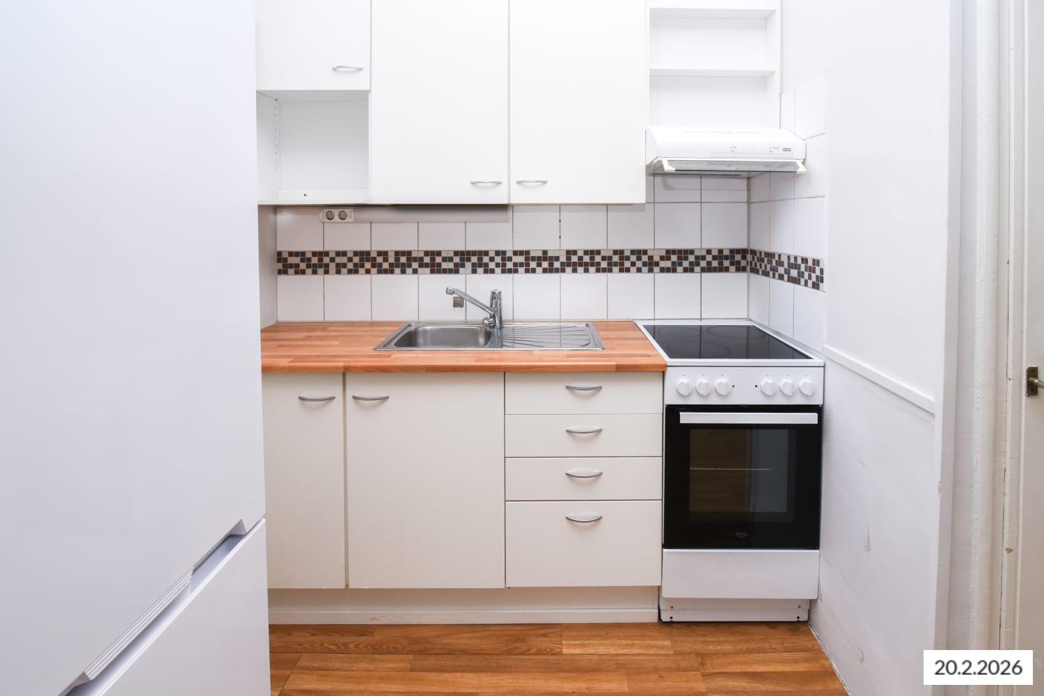 Keittokomerossa on kaasuliesi (kaasu ei sisälly vuokraan), jää-pakastinkaappi ja tilaa astianpesukoneelle. Siisti kylpyhuone on kaakeloitu.