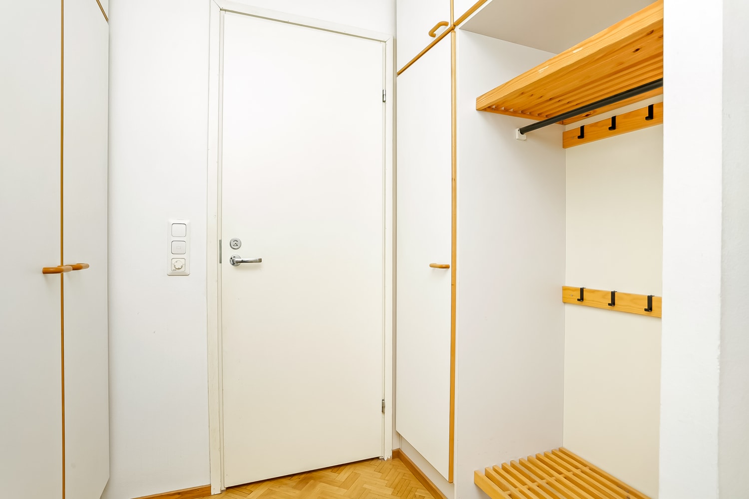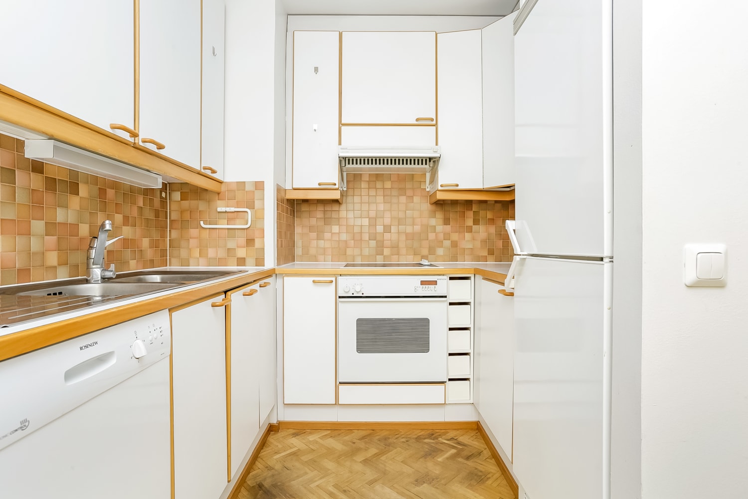 Asuinhuoneissa on parkettilattiat. Kylpyhuoneessa on massalattia ja kaakeloidut seinät. Keittokomerossa on jää-pakastinkaappi, astianpesukone sekä keraaminen sähköliesi.