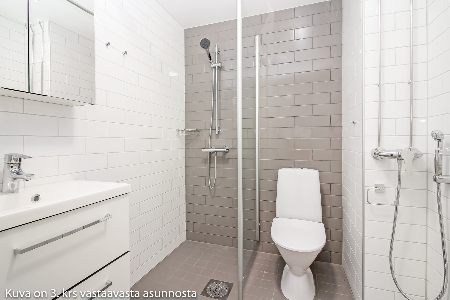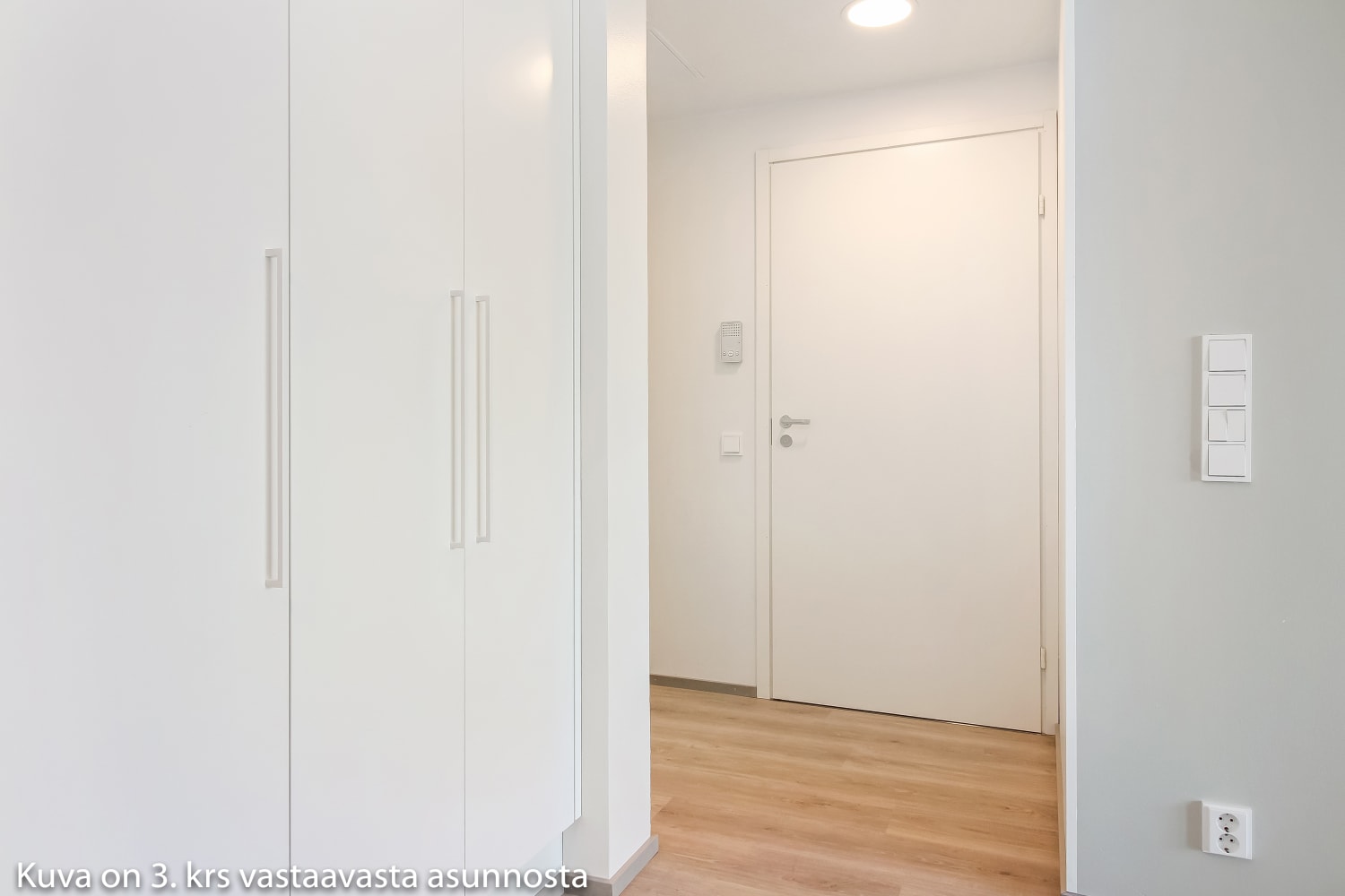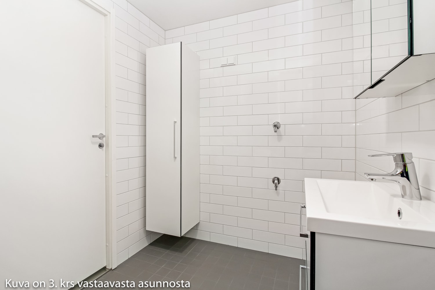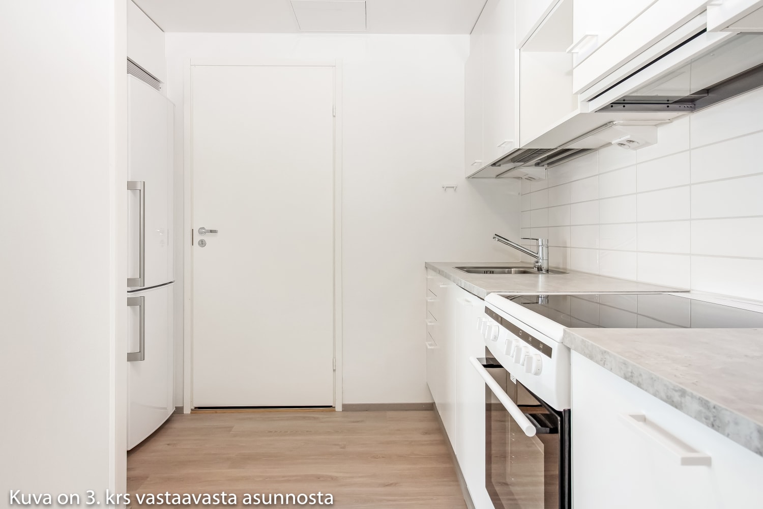 Asuintilojen lattiat ovat tammilankkua mukailevaa laminaattia, jonka sävy on hillitysti vaalean harmaa. Valkoiseksi maalattuja seiniä elävöittää tehosteseinä, jonka murretun harmaa sävy sopii kauniisti lattialaminaatin väriin. Keittiökaapistojen ovet ovat raikkaan valkoiset ja ylä- ja alakaappien välinen tila on laatoitettu kiiltävän valkoisilla laatoilla. Työtaso on harmaata laminaattia. Varustukseen kuuluu keraaminen liesi, astianpesukone ja kylmälaitteet. Kylpyhuoneessa seinät ovat kiiltävän valkoista laattaa ja tehosteseinät ja ovat harmaat. Lattialaatat ovat neutraalin harmaan sävyiset. Pesukoneelle ja kuivausrummulle on varaus.