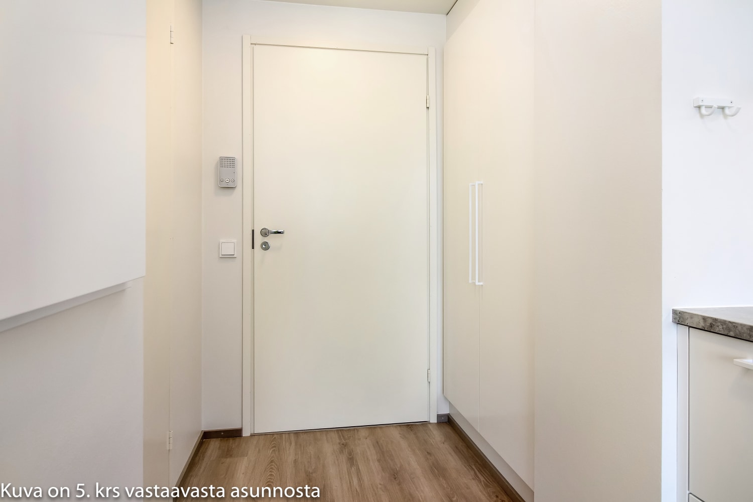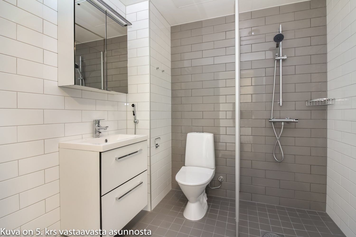 Asuintilojen lattiat ovat tammilankkua mukailevaa laminaattia, jonka sävy on hillitysti vaalean harmaa. Valkoiseksi maalattuja seiniä elävöittää tehosteseinä, jonka murretun harmaa sävy sopii kauniisti lattialaminaatin väriin. Keittiökaapistojen ovet ovat raikkaan valkoiset ja ylä- ja alakaappien välinen tila on laatoitettu kiiltävän valkoisilla laatoilla. Työtaso on harmaata laminaattia. Varustukseen kuuluu keraaminen liesi, astianpesukone ja kylmälaitteet. Kylpyhuoneessa seinät ovat kiiltävän valkoista laattaa ja tehosteseinät ja ovat harmaat. Lattialaatat ovat neutraalin harmaan sävyiset. Pesukoneelle ja kuivausrummulle on varaus.