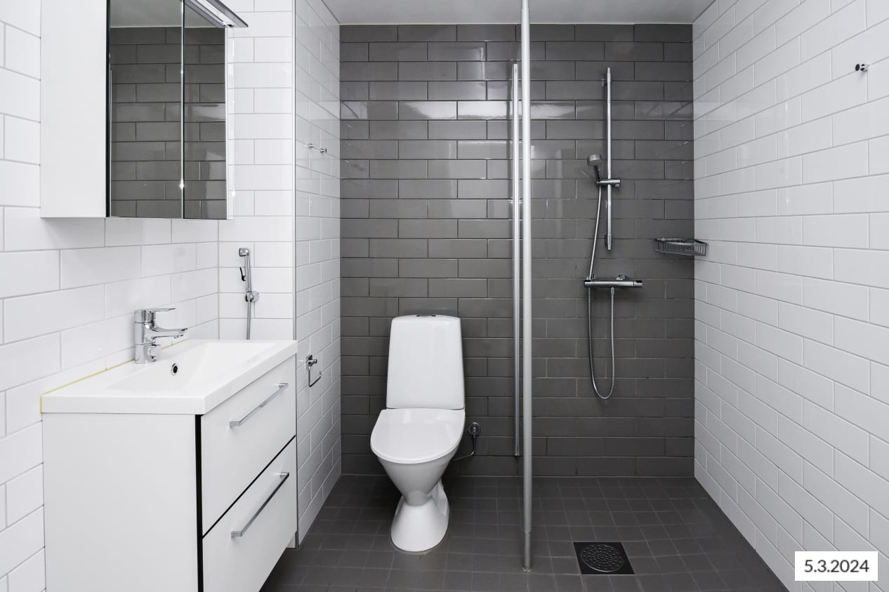 Asuintilojen lattiat ovat tammilankkua mukailevaa laminaattia, jonka sävy on hillitysti vaalean harmaa. Valkoiseksi maalattuja seiniä elävöittää tehosteseinä, jonka murretun harmaa sävy sopii kauniisti lattialaminaatin väriin. Keittiökaapistojen ovet ovat raikkaan valkoiset ja ylä- ja alakaappien välinen tila on laatoitettu kiiltävän valkoisilla laatoilla. Työtaso on harmaata laminaattia. Varustukseen kuuluu keraaminen liesi, astianpesukone ja kylmälaitteet. Kylpyhuoneessa seinät ovat kiiltävän valkoista laattaa ja tehosteseinät ja ovat harmaat. Lattialaatat ovat neutraalin harmaan sävyiset. Pesukoneelle ja kuivausrummulle on varaus.