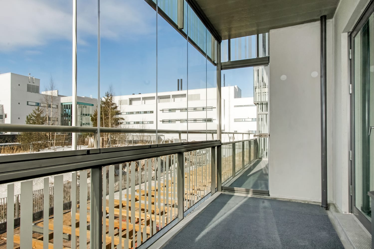 Talon päädyssä sijaitsevan tilavan kodin ikkunat aukeavat kahteen ilmansuuntaan. Olohuone ja avoin keittiö muodostavat yhdessä selkeän oleskelualueen, joka on helppo kalustaa asujansa näköiseksi. Makuuhuoneet on ryhmitelty vierekkäin asunnon toiselle puolelle. Kodin lisäilo on suuri parveke, jonka lasitettu osuus on kuin kesähuone ja lasittamaton osuus sopii vaikkapa ruukkupuutarhurin keitaaksi.
