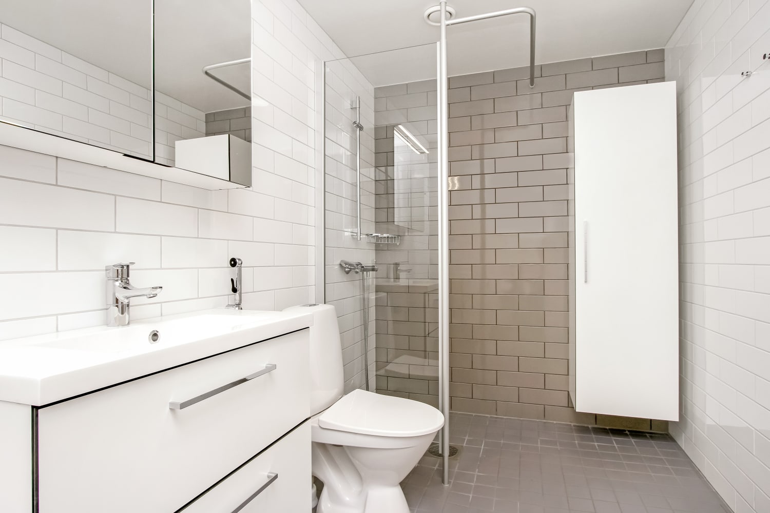 Asuintilojen lattiat ovat tammilankkua mukailevaa laminaattia, jonka sävy on hillitysti vaalean harmaa. Valkoiseksi maalattuja seiniä elävöittää tehosteseinä, jonka murretun harmaa sävy sopii kauniisti lattialaminaatin väriin. Keittiökaapistojen ovet ovat raikkaan valkoiset ja ylä- ja alakaappien välinen tila on laatoitettu kiiltävän valkoisilla laatoilla. Työtaso on harmaata laminaattia. Varustukseen kuuluu keraaminen liesi, astianpesukone ja kylmälaitteet. Kylpyhuoneessa seinät ovat kiiltävän valkoista laattaa ja tehosteseinät ja ovat harmaat. Lattialaatat ovat neutraalin harmaan sävyiset. Pesukoneelle ja kuivausrummulle on varaus.