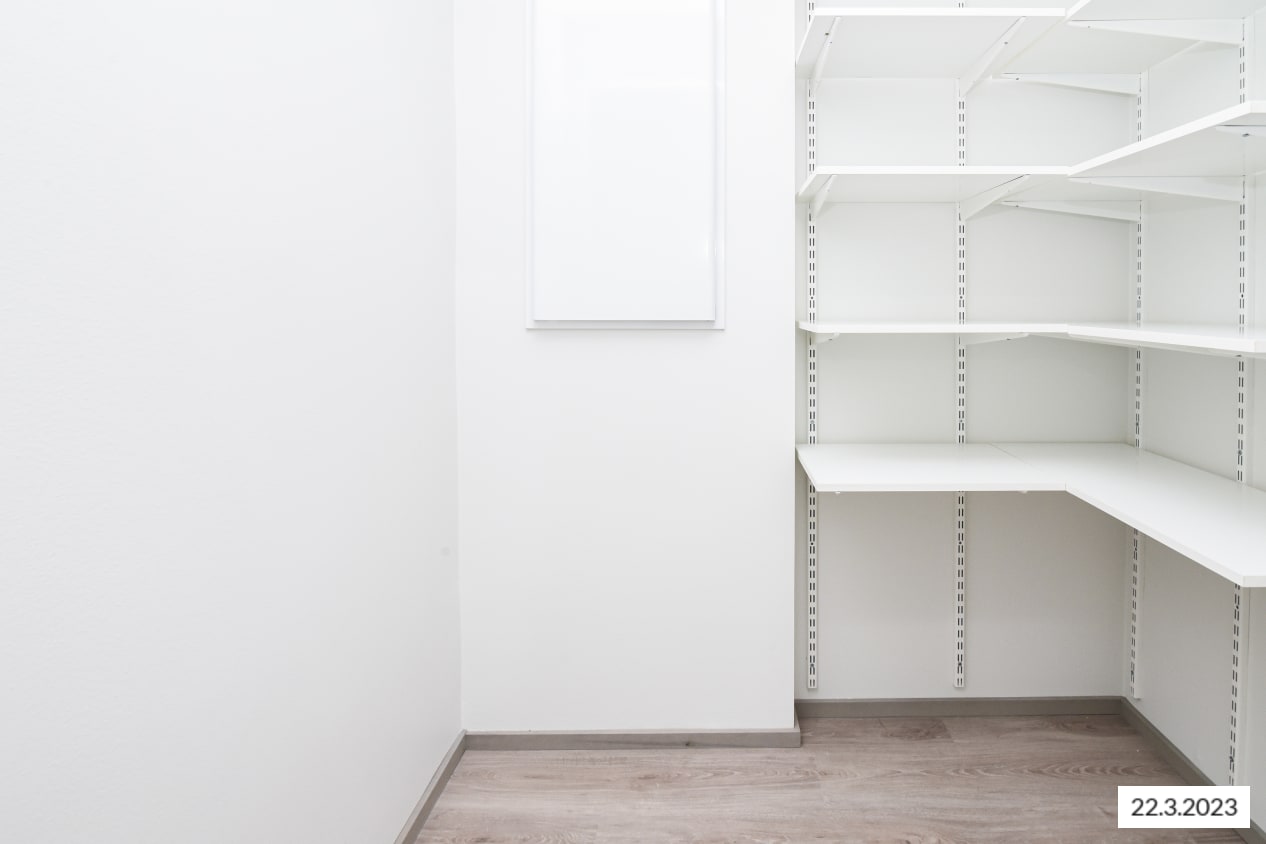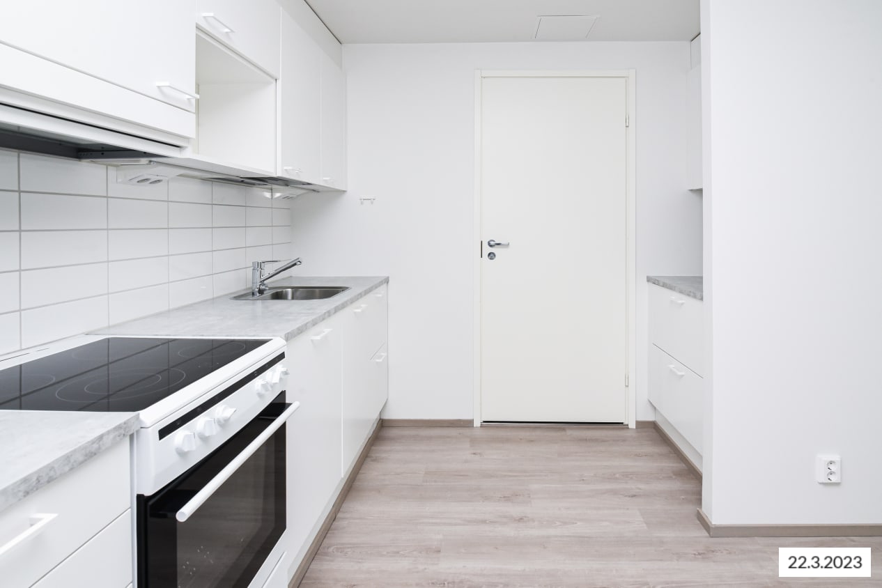 Asuintilojen lattiat ovat tammilankkua mukailevaa laminaattia, jonka sävy on hillitysti vaalean harmaa. Valkoiseksi maalattuja seiniä elävöittää tehosteseinä, jonka murretun harmaa sävy sopii kauniisti lattialaminaatin väriin. Keittiökaapistojen ovet ovat raikkaan valkoiset ja ylä- ja alakaappien välinen tila on laatoitettu kiiltävän valkoisilla laatoilla. Työtaso on harmaata laminaattia. Varustukseen kuuluu keraaminen liesi, astianpesukone ja kylmälaitteet. Kylpyhuoneessa seinät ovat kiiltävän valkoista laattaa ja tehosteseinät ja ovat harmaat. Lattialaatat ovat neutraalin harmaan sävyiset. Pesukoneelle ja kuivausrummulle on varaus.
