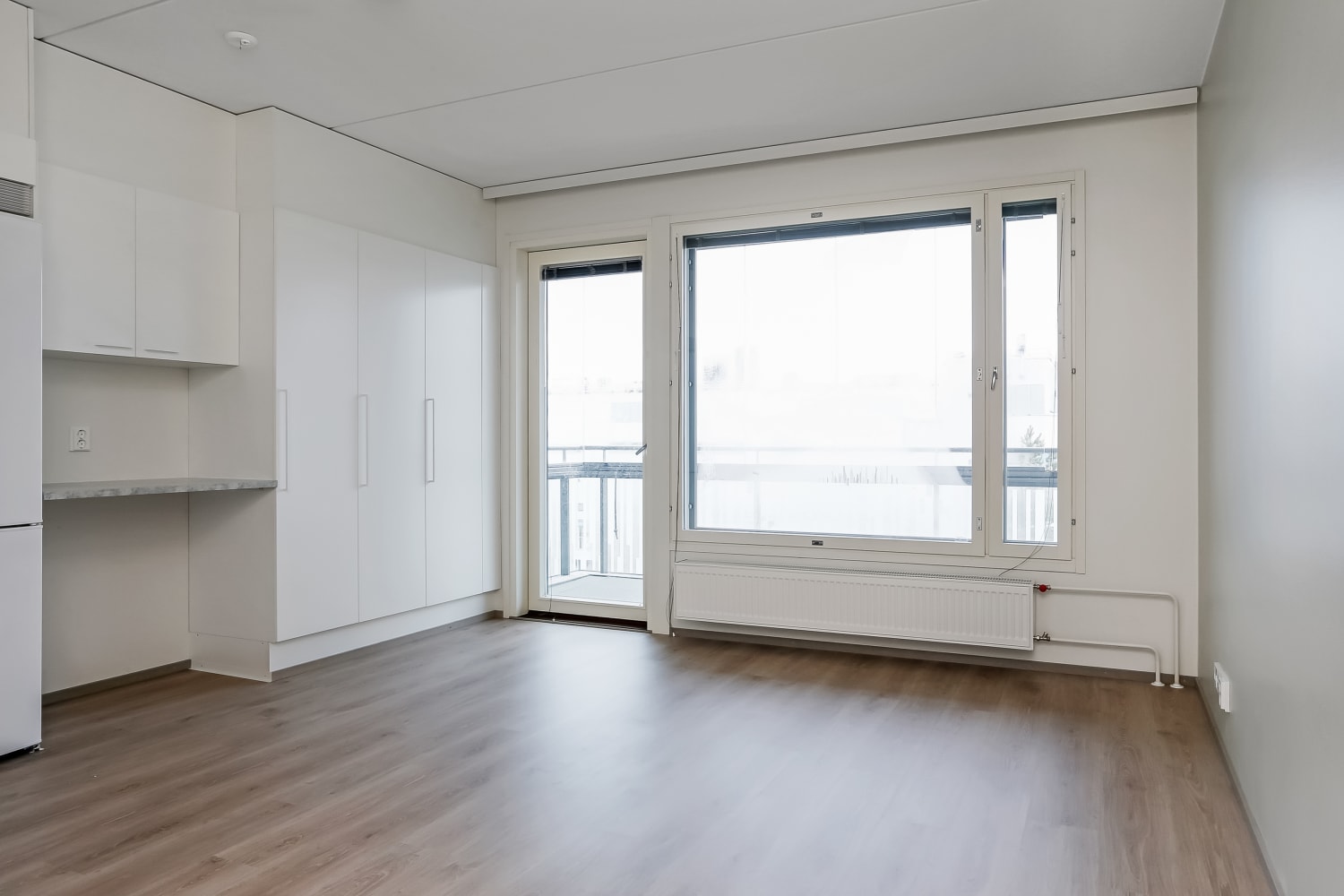 Kaunis, vaaleasävyinen yksiö on helppo sisustaa omaksi kodiksi. Keittiö ja olohuone yhdistyvät avaraksi oleskelualueeksi ja lepopaikaksi sopii eteisen seinän suojasta löytyvä alkovi. Pihan puolelle aukeava lasitettu parveke on kuin lisähuone, jonka voi sisustaa viihtyisäksi kesäkeitaaksi.