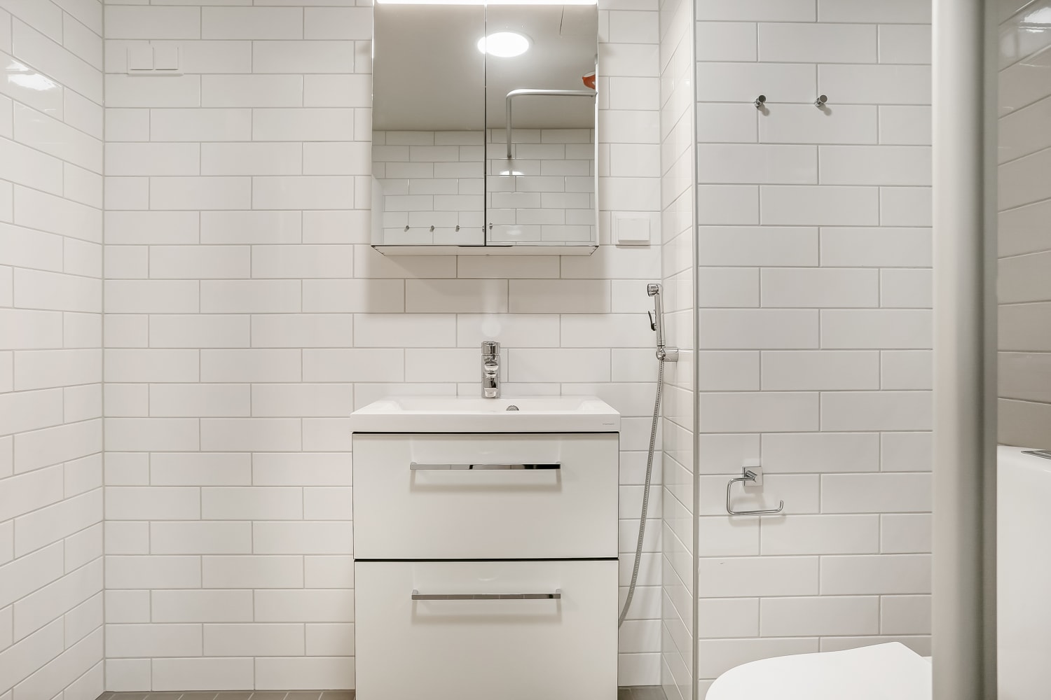 Asuintilojen lattiat ovat tammilankkua mukailevaa laminaattia, jonka sävy on hillitysti vaalean harmaa. Valkoiseksi maalattuja seiniä elävöittää tehosteseinä, jonka murretun harmaa sävy sopii kauniisti lattialaminaatin väriin. Keittiökaapistojen ovet ovat raikkaan valkoiset ja ylä- ja alakaappien välinen tila on laatoitettu kiiltävän valkoisilla laatoilla. Työtaso on harmaata laminaattia. Varustukseen kuuluu keraaminen liesi, astianpesukone ja kylmälaitteet. Kylpyhuoneessa seinät ovat kiiltävän valkoista laattaa ja tehosteseinät ja ovat harmaat. Lattialaatat ovat neutraalin harmaan sävyiset. Pesukoneelle ja kuivausrummulle on varaus.