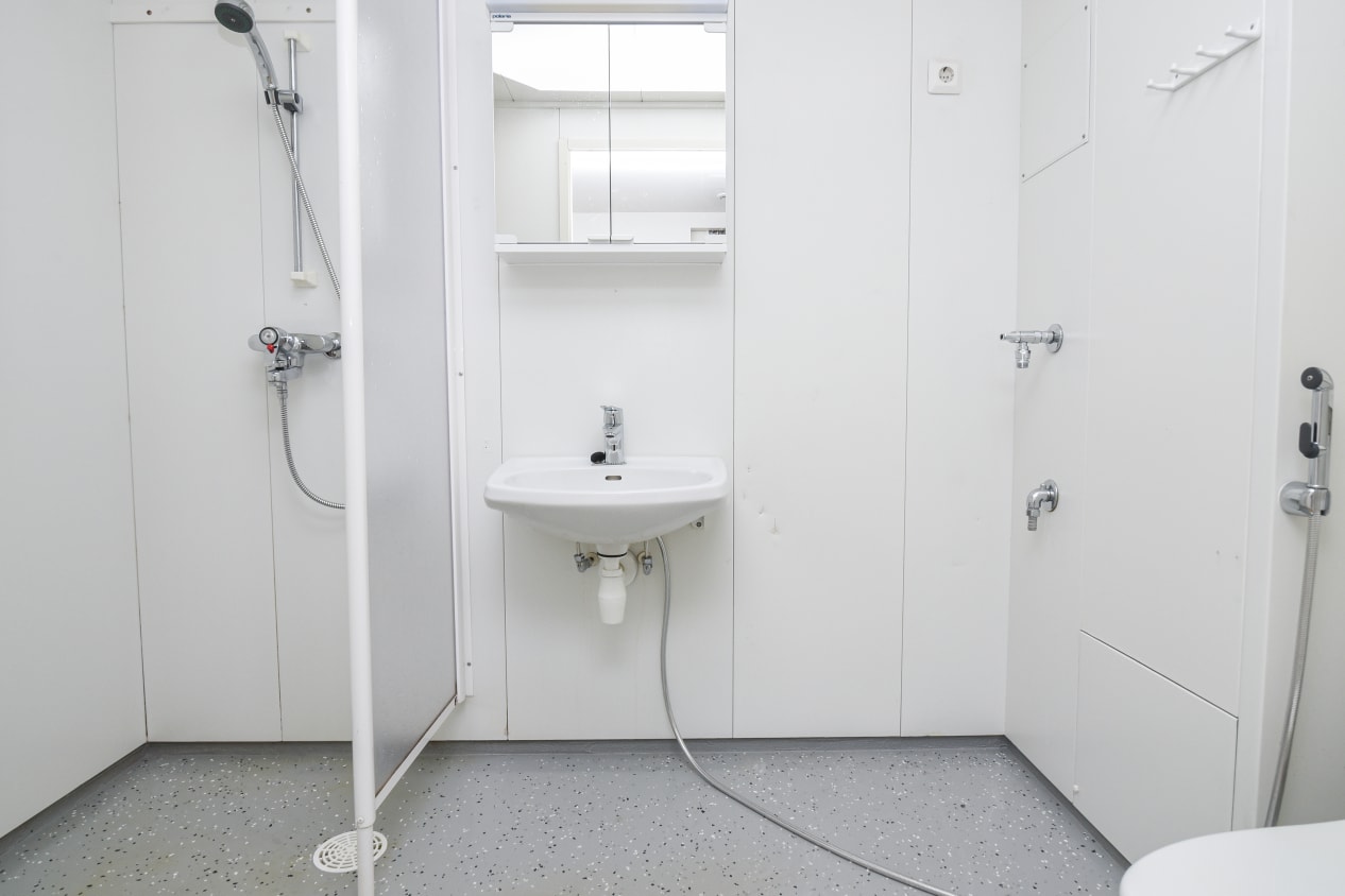 Kylpyhuoneen seinät ovat valkoiset ja siellä on helppohoitoinen massalattia. Pesukoneelle on paikka ja liitännät.