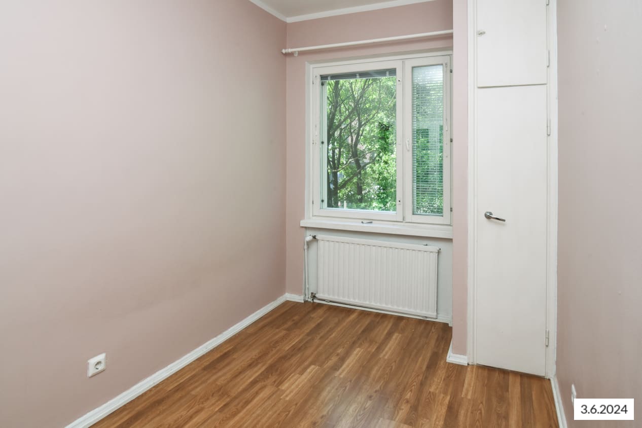 Keskuspuiston kupeessa, hyvien kulkuyhteyksien varrella vapautuneen pikkukaksion ikkunoista avautuu näkymä länteen pihan yli Mannerheimintielle. Kompaktissa pohjaratkaisussa keittokomeron vieressä on pieni tila ruokapöydälle ja eteinen suodattaa mukavasti porraskäytävän äänet.