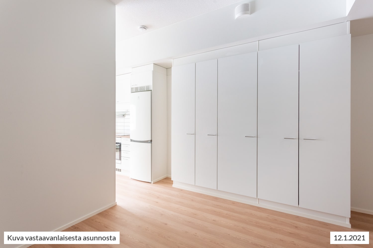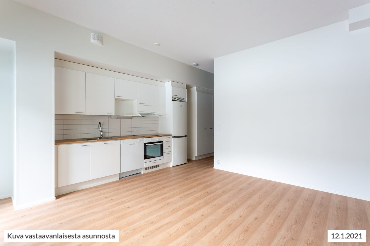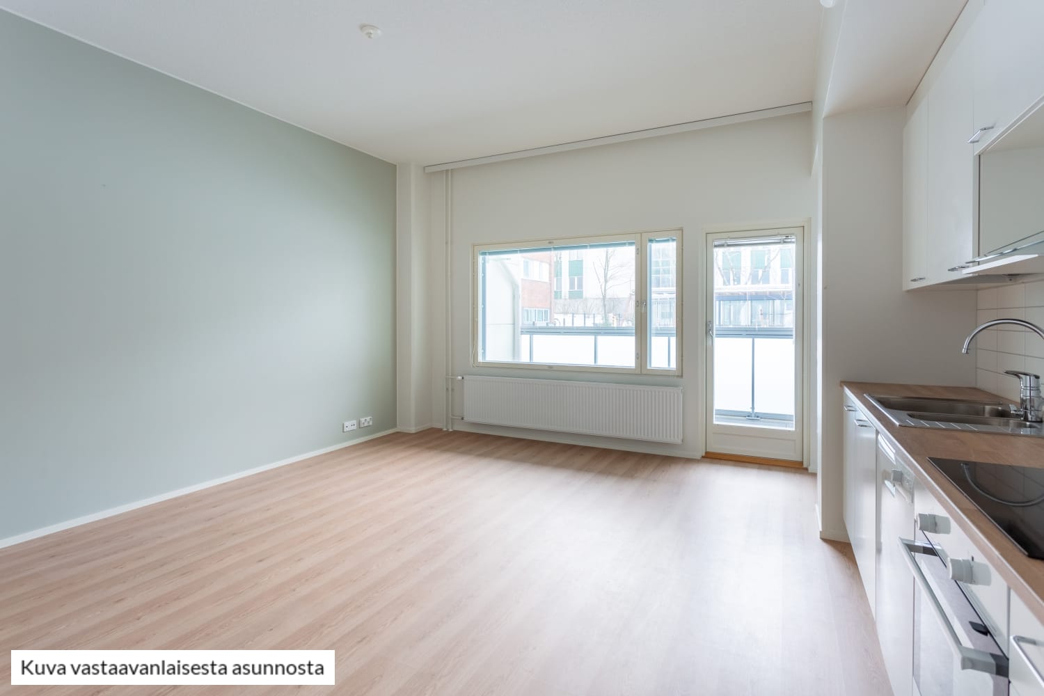 Yksiössä on vaalea puukuvioitu laminaattilattia ja yksi seinistä on harmaasävyinen. Keittiön varusteluun kuuluvat astianpesukone, induktioliesi ja jääkaappipakastin. Ikkunoissa on valmiiksi sälekaihtimet.