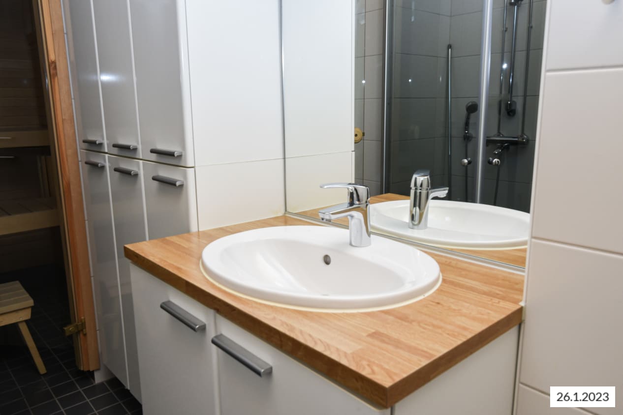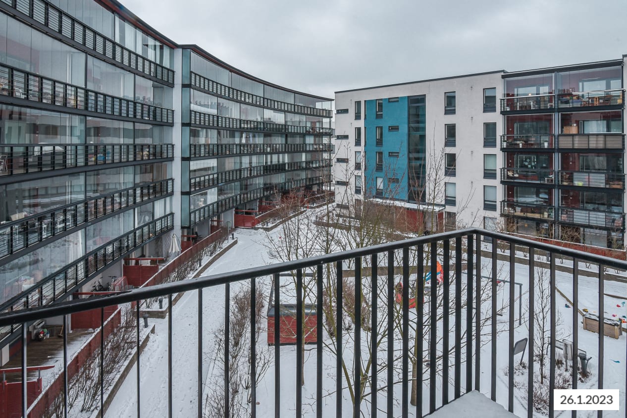 Tämän tilavan kodin valtti on upea, avara olohuone, jonka ikkunat avautuvat kolmeen ilmansuuntaan. Kipsirapatut kattopalkit, tyylikäs tammilautaparketti ja osittain lasiset väliseinät tuovat asuntoon ainutlaatuisen tunnelman. Aamuaurinkoon pihan puolelle avautuvalle parvekkeelle pääsee keittiöstä, joka jatkaa asunnon linjakkuutta mustilla kivitasoillaan, integroidulla astianpesukoneellaan sekä keraamisella liedellä ja erillisellä uunilla. Kauttaaltaan kaakeloidussa kylpyhuoneessa on mukavuuslattialämmitys ja saunassa persoonallinen sisäikkuna.