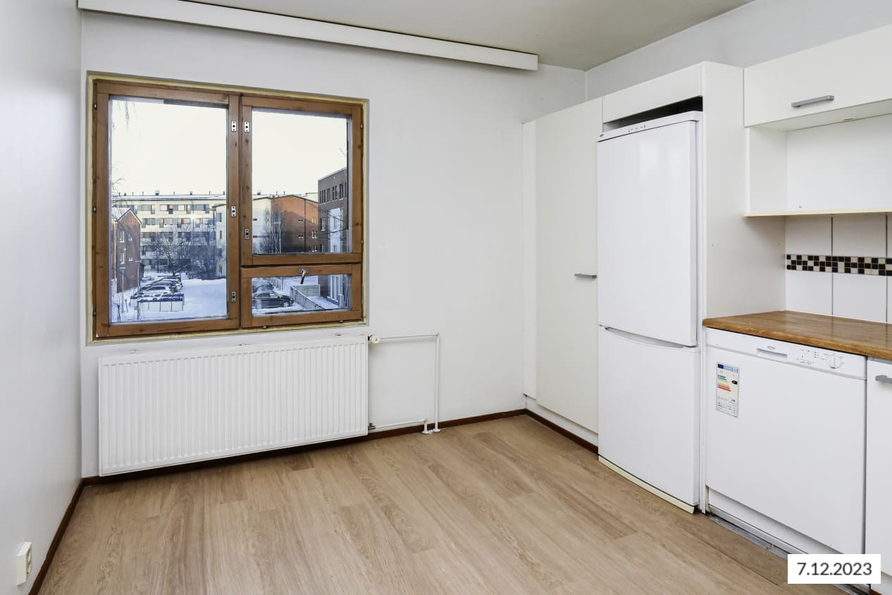 Keittiössä on jää-pakastinkaappi, nelilevyinen liesi sekä varaus astianpesukoneelle.