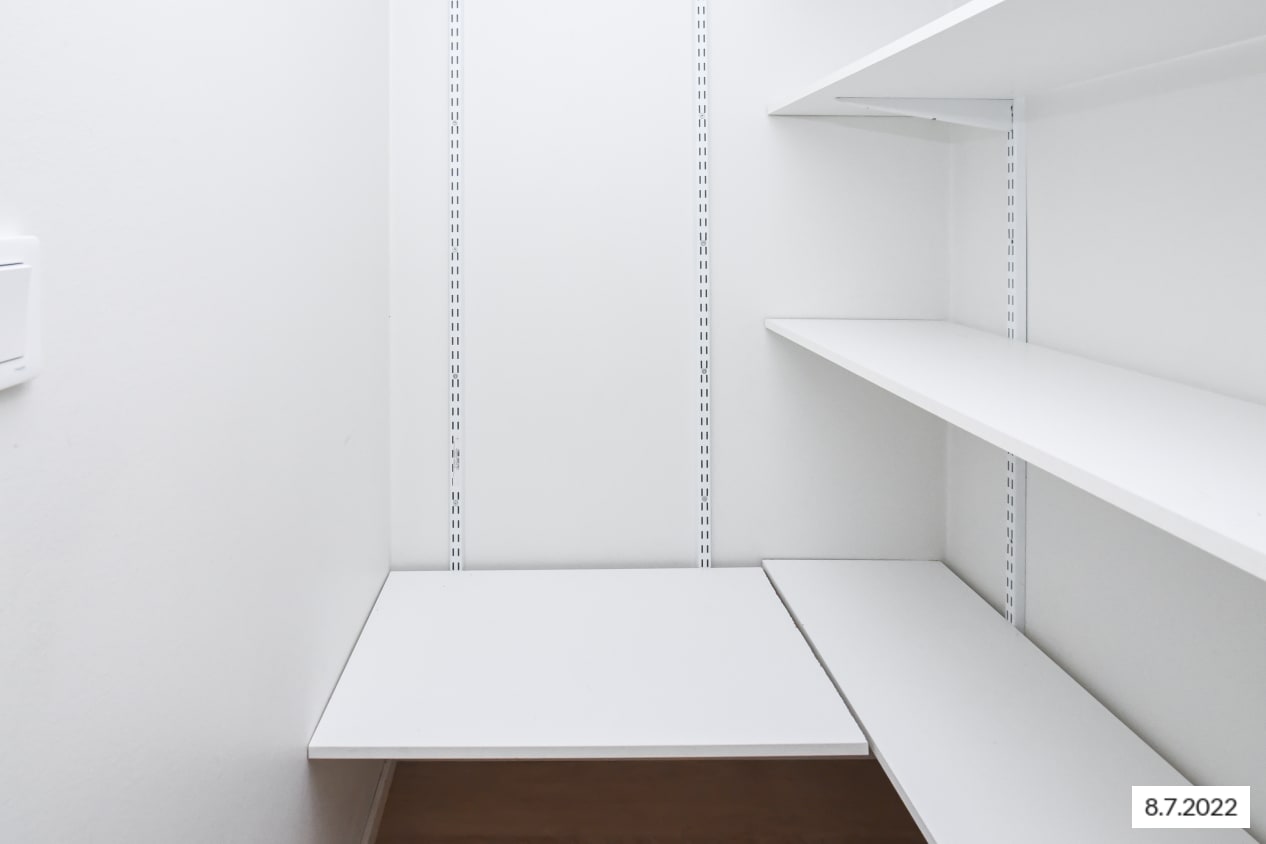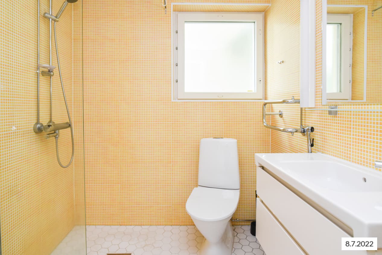 2015 remontoidun, vaaleasävyisen kodin lattiat ovat kaunista valkoista tammilankkua mukailevaa laminaattia. Keittiön kaapistot ovat raikkaan valkoiset ja ylä- ja alakaappien välinen tila on laatoitettu pirteällä auringon keltaisella laatalla. Laminaattityötaso on valkoinen. Varustukseen kuuluu keraaminen liesi ja jääkaappi. Kylpyhuoneen seinät on laatoitettu keltaisilla mosaiikkilaatoilla ja lattiat ovat valkoista kuusikulmaista laattaa.