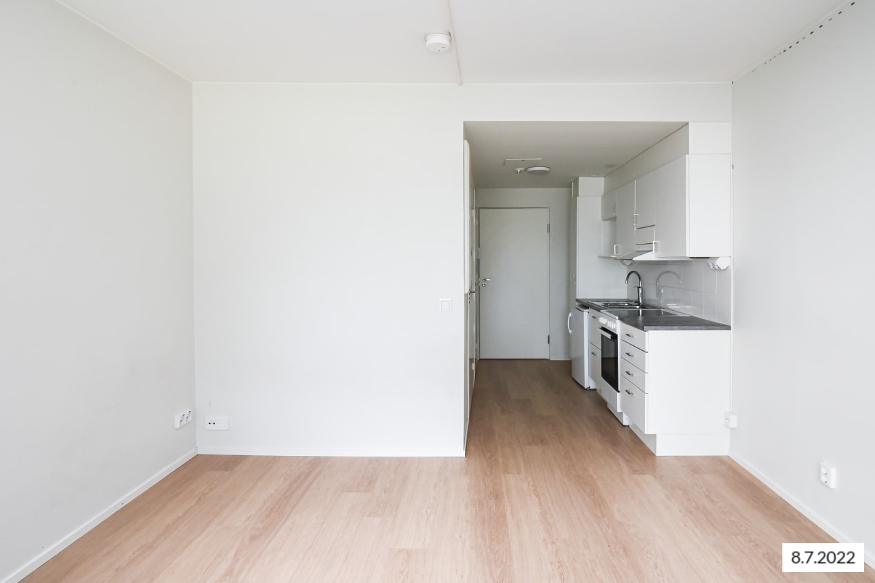 Viihtyisän pikku kodin iso, länteen aukeava ikkuna tuo iltapäivän auringonsäteet sisälle saakka. Olohuoneeseen yhdistyvän keittokomeron jatkeeksi mahtuu pieni ruokapöytä ja tilaa vaatesäilytykselle löytyy erillisestä vaatehuoneesta.