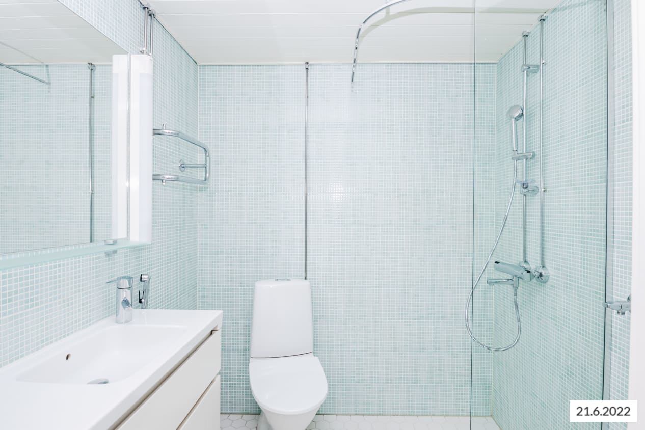 Kylpyhuoneen kalusteet ovat kotimaista Kide-mallistoa. Seinät on laatoitettu vedenvihreillä mosaiikkilaatoilla ja lattiat ovat valkoista kuusikulmaista laattaa.