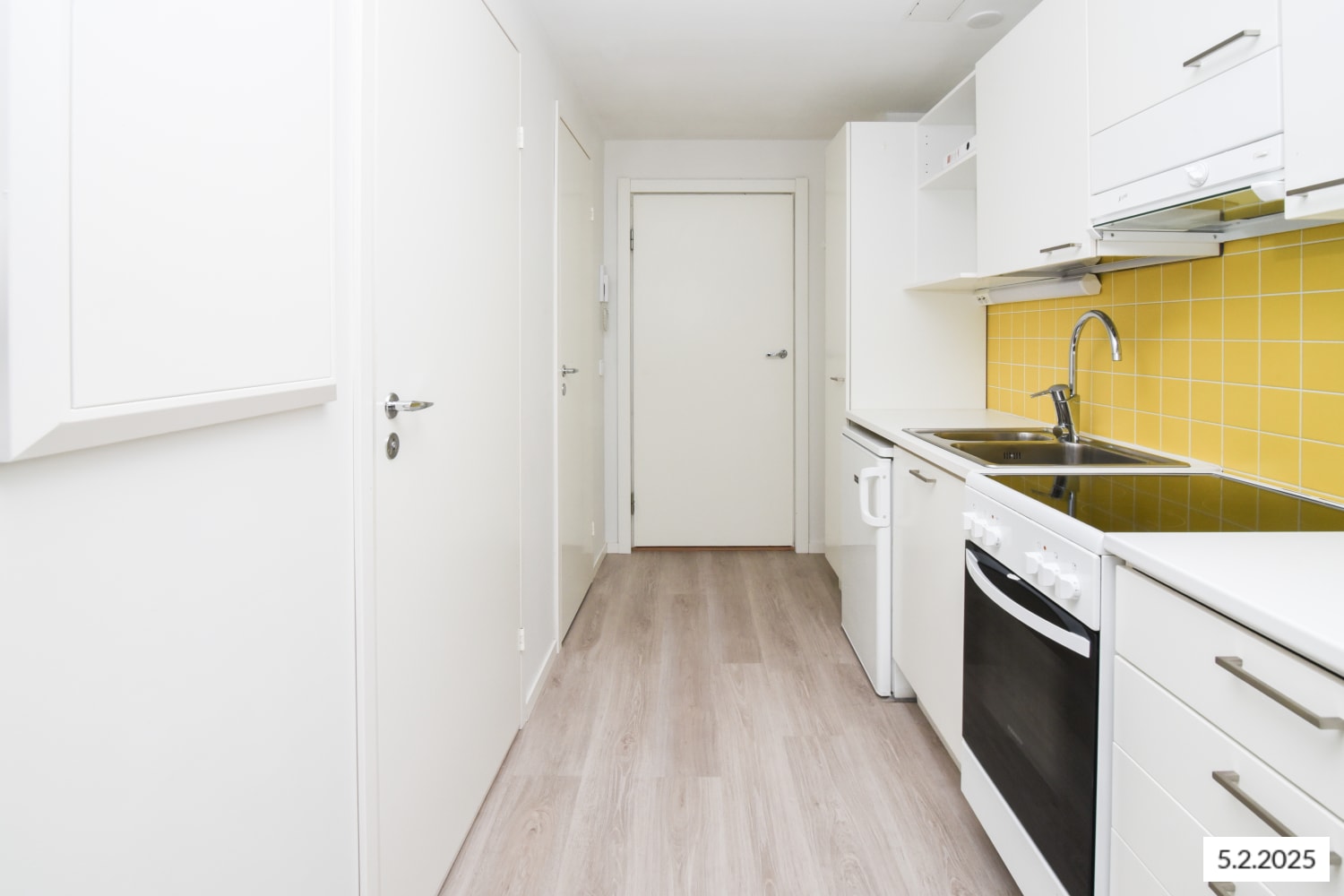 2015 remontoidun, vaaleasävyisen kodin lattiat ovat kaunista valkoista tammilankkua mukailevaa laminaattia. Keittiön kaapistot ovat raikkaan valkoiset ja ylä- ja alakaappien välinen tila on laatoitettu pirteällä auringon keltaisella laatalla. Laminaattityötaso on valkoinen. Varustukseen kuuluu keraaminen liesi ja jääkaappi. Kylpyhuoneen seinät on laatoitettu keltaisilla mosaiikkilaatoilla ja lattiat ovat valkoista kuusikulmaista laattaa.