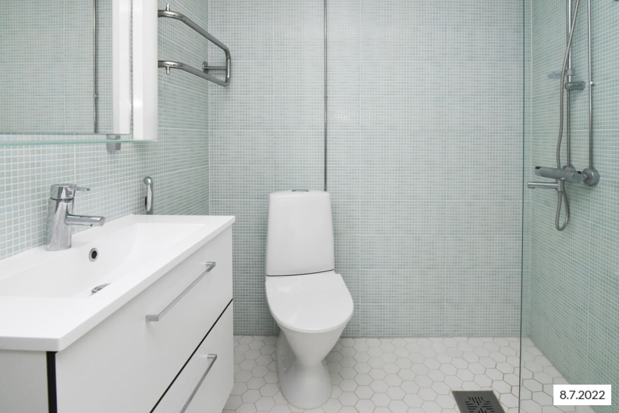 Kylpyhuoneen seinät on laatoitettu vedenvihreillä mosaiikkilaatoilla ja lattiat ovat valkoista kuusikulmaista laattaa.