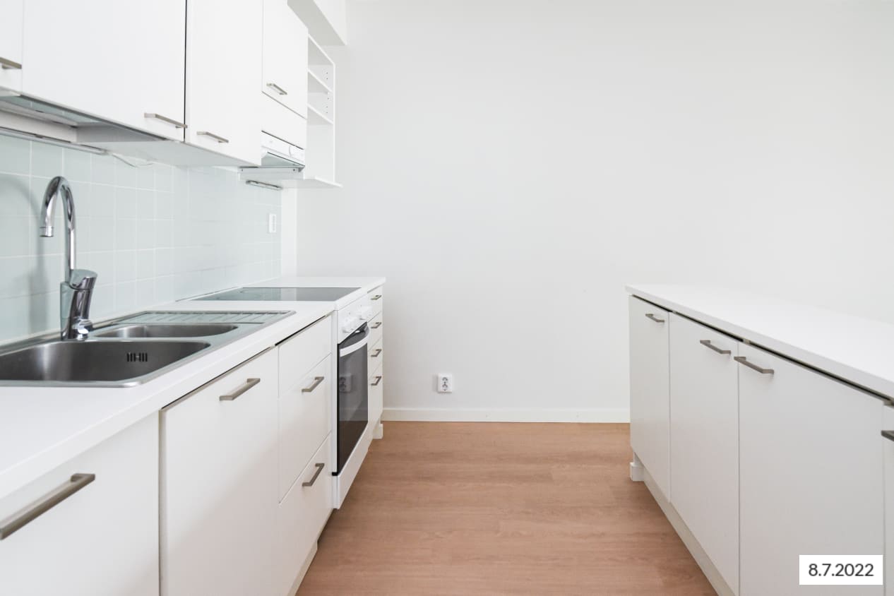 Vaaleasävyisen kodin lattiat ovat kaunista valkoista tammilankkua mukailevaa laminaattia. Keittiön kaapistot ovat raikkaan valkoiset ja ylä- ja alakaappien välinen tila on laatoitettu vedenvihreällä laatalla. Laminaattityötaso on valkoinen. Varustukseen kuuluu keraaminen liesi, jääkaappipakastin ja kalusteisiin integroitu astianpesukone. Kylpyhuoneen seinät on laatoitettu isoilla kiiltävän valkoisilla laatoilla ja suihkunurkkausta elävöittää vedenvihreä laatoitus. Lattiat ovat kuusikulmaista laattaa, jonka sävy on vaalea beige. Pesukoneelle ja kuivausrummulle on tilavaraus.