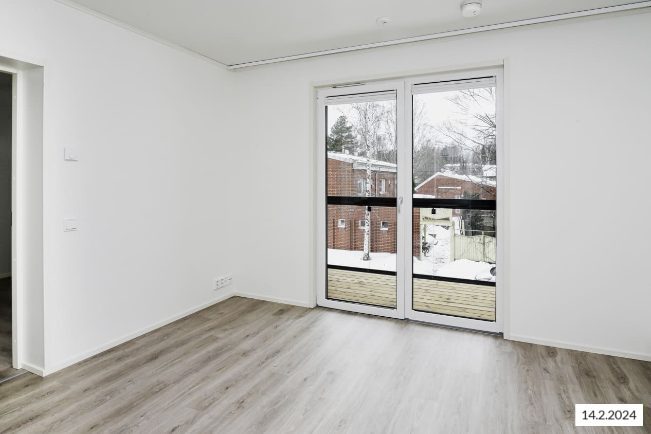 Keväällä 2022 valmistuneen luhtitalon toisen kerroksen kaksio on kaunis ja kodikas. Avoin keittiö ja olohuone ovat yhtenäistä tilaa, jonka jatkeena oleva lasitettu parveke tarjoaa lisätilaa oleskeluun. Kodin pintamateriaalit ovat ajattoman tyylikkäitä. Asuintiloissa lattia on vaaleasävyistä laminaattia ja seinät on maalattu valkoisiksi. Linjakkaassa avokeittiössä on valkoiset puusyykuvioiset kalusteet, joissa on mustat lankavetimet. Ylä- ja alakaappien välinen tila on valkoista levyä ja työtaso hillitysti kuvioitua terästä. Varustukseen kuuluu induktiokeittotaso, kalusteuuni, jääkaappipakastin ja astianpesukone. Kodinkoneet ovat valkoisia. Kylpyhuoneessa on valkoiset SATOn Kide-malliston kalusteet ja paikka pyykinpesukoneelle ja kuivausrummulle. Seinät ovat valkoista laattaa ja lattia on harmaa. Eteisessä on tummanharmaa laattalattia ja mustaksi maalattu tehosteseinä metallisen naulakon taustalla.