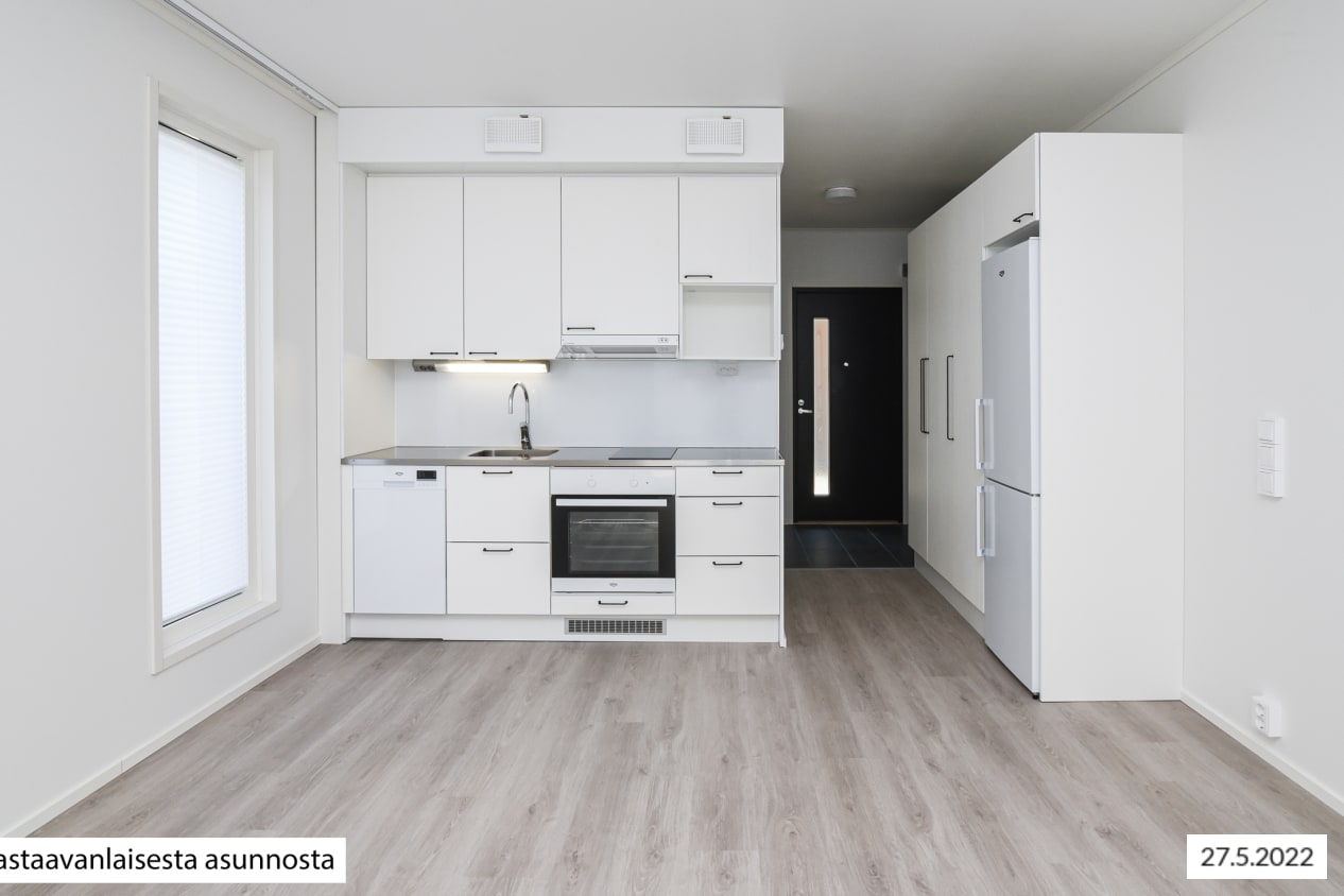 Keväällä 2022 valmistuneen luhtitalon ensimmäisen kerroksen yksiö on selkeä ja kompakti. Avoin keittiö ja olohuone ovat yhtenäistä tilaa, joka jatkuu lasitetulle terassille. Terassilta pääsee kätevästi lasioven kautta pihalle. Kodin pintamateriaalit ovat ajattoman kauniita. Asuintiloissa lattia on vaaleasävyistä laminaattia ja seinät on maalattu valkoisiksi. Avokeittiössä on valkoiset puusyykuvioiset kalusteet, joissa on mustat lankavetimet. Ylä- ja alakaappien välinen tila on valkoista levyä ja työtaso hillitysti kuvioitua terästä. Varustukseen kuuluu induktiokeittotaso, kalusteuuni, jääkaappipakastin ja astianpesukone. Kodinkoneet ovat valkoisia. Kylpyhuoneessa on valkoiset SATOn Kide-malliston kalusteet ja paikka pyykinpesukoneelle ja kuivausrummulle. Seinät ovat valkoista laattaa ja lattia on harmaa. Eteisessä on tummanharmaa laattalattia ja mustaksi maalattu tehosteseinä metallisen naulakon taustalla