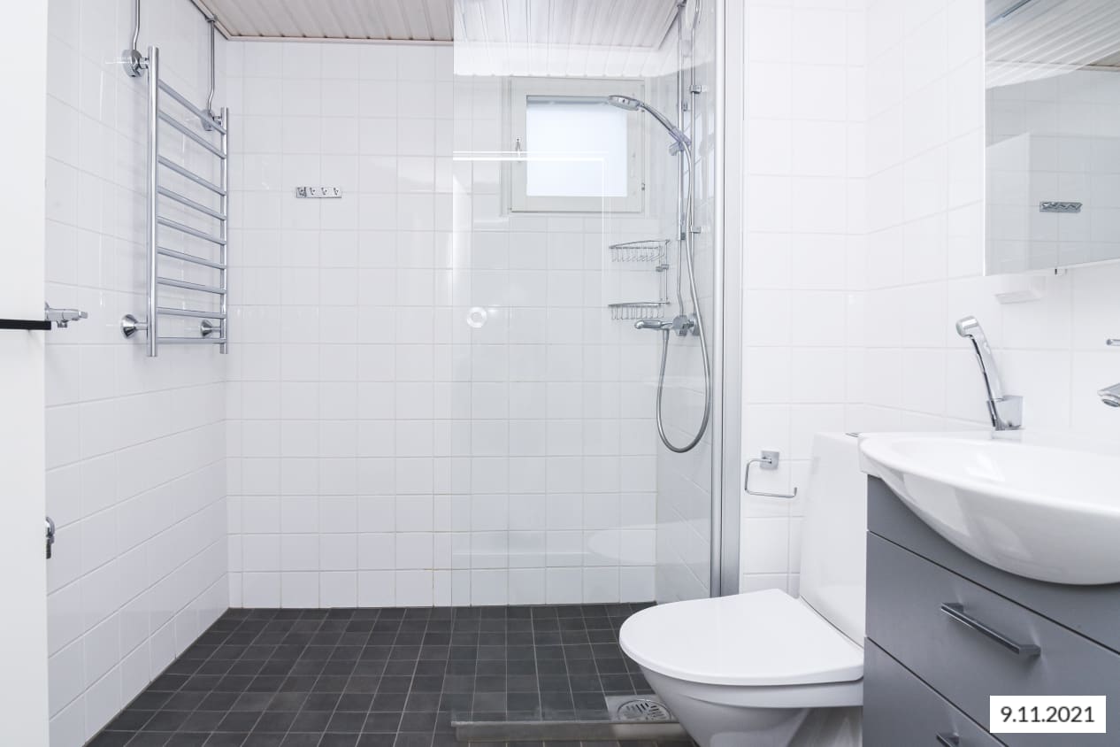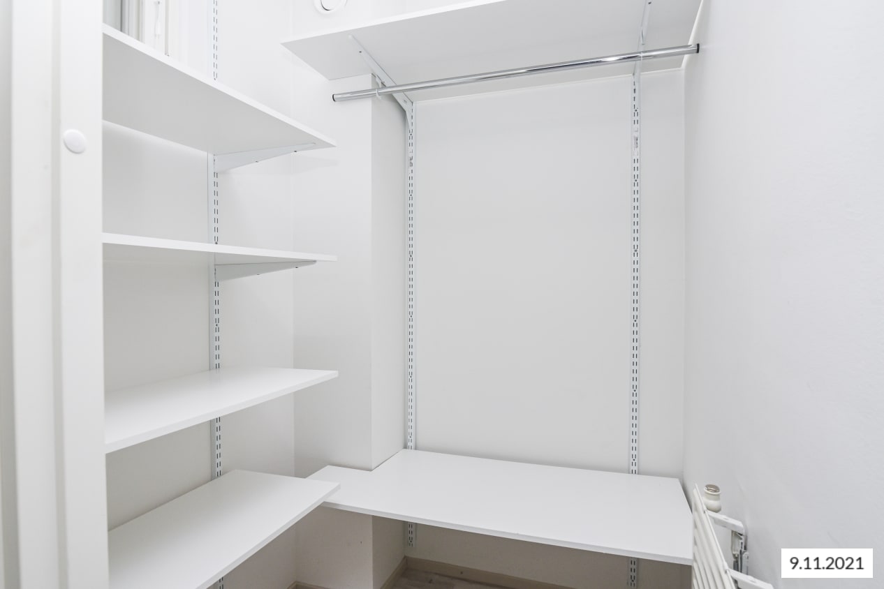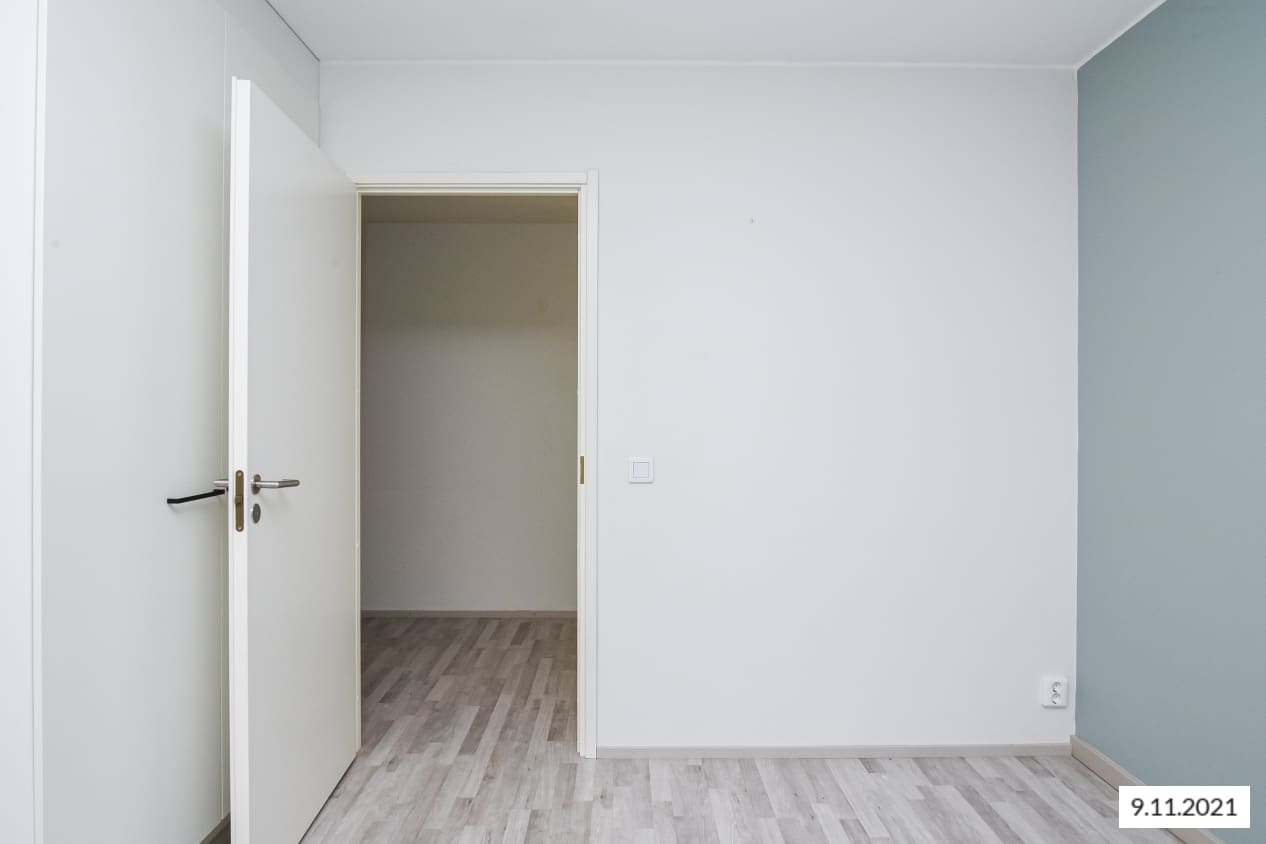 Vaaleasävyisen kodin lattiat ovat tammilaminaattia ja seinät on maalattu valkoisiksi. Olohuoneessa tunnelmaa pehmentää vaalean harmaaksi maalattu tehosteseinä. Eteisessä on peililiukuovin varustetut kaapistot. Keittiössä kaapistojen ovet ovat valkoiset ja työtaso on harmaata laminaattia. Ylä- ja alakaappien välisessä tilassa on työtason väriin sopiva harmaa laminaatti. Varustukseen kuuluu astianpesukone, kylmälaitteet, keraaminen liesi, liesikupu ja varaus mikroaaltouunille. Kylpyhuoneessa seinät ovat valkoista ja lattiat hillityn harmaata laattaa. Pyykinpesukoneelle on tilavaraus.