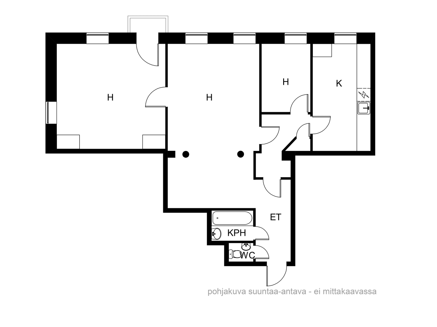 Reilunkokoisen kolmion asuinhuoneiden lattiamateriaalina on laminaatti. Kylpyhuoneessa on massalattia ja laatoitetut seinät.