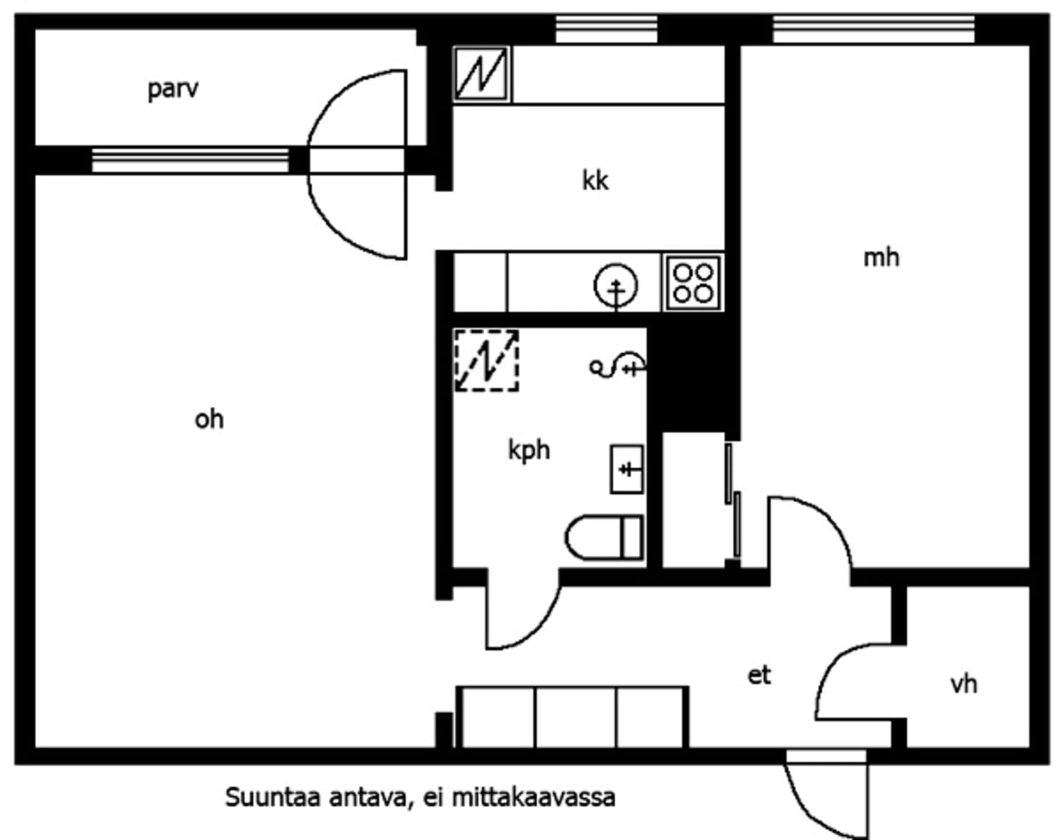 Asunnossa olohuoneen ja makuuhuoneen parkettilattioita täydentävät eteisen ja keittokomeron tyylikkäät laattalattiat. Kylpyhuone on kokonaan kaakeloitu. Eteisen ilmettä avartavat peililiukuovikaapistot. Makuuhuoneessa on ääneneristyslevy ja pimentävät kaihtimet. Valoisassa keittokomerossa on jää-pakastinkaappi ja nelilevyinen sähköliesi sekä paikka mikroaaltouunille.