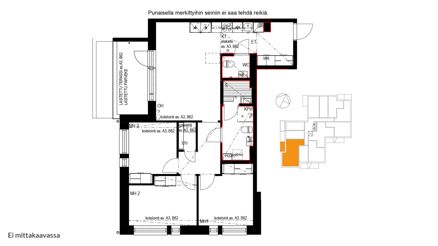 Sympaattisessa neliössä on tilaa pyörittää arkea, harrastaa, levätä ja oleilla. Kodissa on reilun kokoinen olohuone, siihen saumattomasti yhdistyvä keittiö, kolme makuuhuonetta, vaatehuone ja sauna. Käytännöllisen keittiö/olohuoneen voi kalustaa usealla tavalla niin, että sekä ruokailulle että oleskelulle on omat paikkansa. Arjen sujuvuutta lisäävät myös hyvin suunnitellut säilytysratkaisut: sekä eteisessä että makuuhuoneissa on mukavasti vaatekaappeja ja lisää säilytystilaa löytyy erillisestä vaatehuoneesta. Tilavassa kylpyhuoneessa on tilaa sekä spa-elämyksille että tilavaraus pyykkikoneelle. Omasta saunasta voi mennä vilvoittelemaan lasitetulle parvekkeelle. Pintojen neutraalit värivalinnat ovat toimiva pohja omalle, persoonalliselle sisustustyylillesi. Tämä moneen muuntautuva koti tarjoaa kaiken, mitä hyvään arkeen tarvitaan. Olisiko tämä sinun uusi vuokrakotisi?