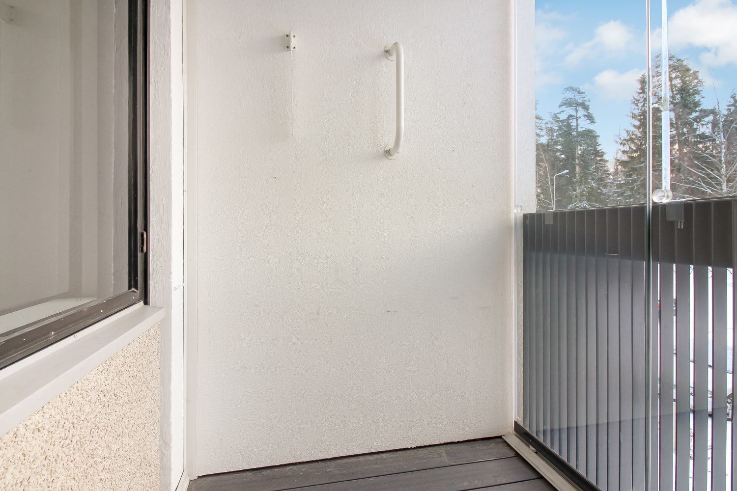 Mukavan suojaisassa pihapiirissä vapautuneen kolmion pohjaratkaisu on perinteinen ja selkeä. Makuuhuoneet on sijoitettu vierekkäin ja niillä on yhteinen vaatehuone. Keittiö ja olohuone muodostavat kodikkaan kokonaisuuden ja tilava eteinen ilahduttaa etenkin lapsiperheen kaitsijaa. Asunnon parveke avautuu eteläkaakkoon.