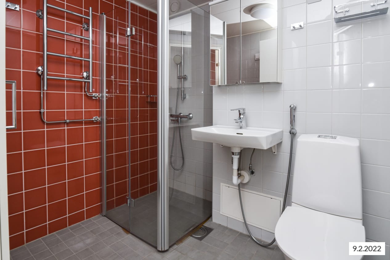 Asuintilojen lattiat ovat valkaistua tammilankkua mukailevaa laminaattia ja seinät on maalattu murretun valkoisiksi. Komerot ovat valkoisia. Keittiössä kaapistojen ovet ovat valkoiset ja ylä- ja alakaappien välinen laatoitus on ruusunmarjan sävyinen. Työtaso on valkoinen. Varustukseen kuuluu keraaminen liesi, astianpesukone ja jääkaappipakastin. Kylpyhuoneessa lattiat ovat hillityn harmaata laattaa. Seinät on laatoitettu pääosin vaaleanharmaalla laatalla, jota elävöittää ruusunmarjan värinen tehosteseinä. Pesukoneelle ja kuivausrummulle on varaus.