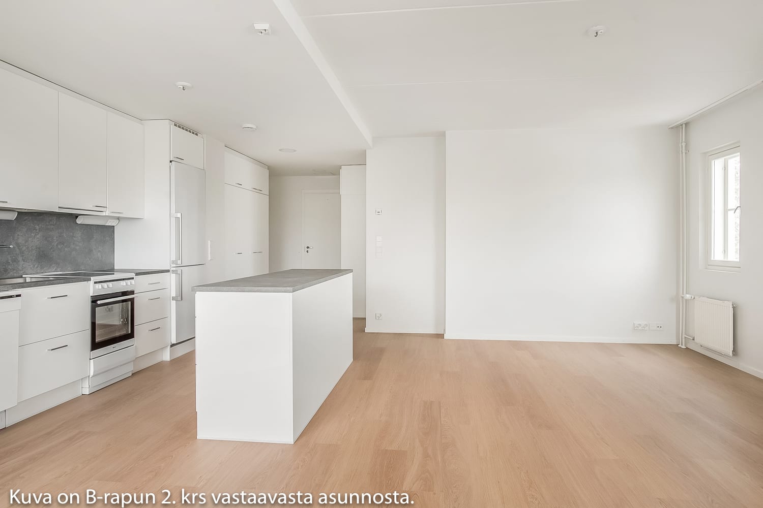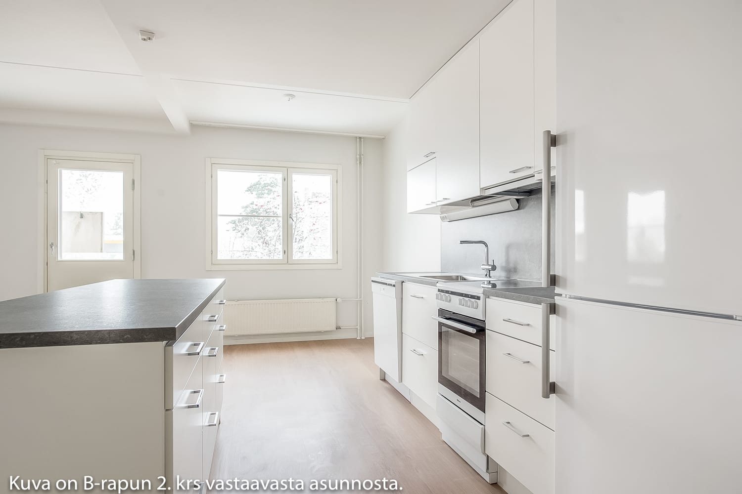 Asuintilojen lattiat ovat valkaistua tammilankkua mukailevaa laminaattia ja seinät on maalattu murretun valkoisiksi. Komerot ovat valkoisia. Keittiössä kaapistojen ovet ovat valkoiset ja työtaso taustoineen on harmaata laminaattia. Kotikokin ja kavereiden iloksi keittiössä on valmiina astianpesukone ja keraaminen liesi.