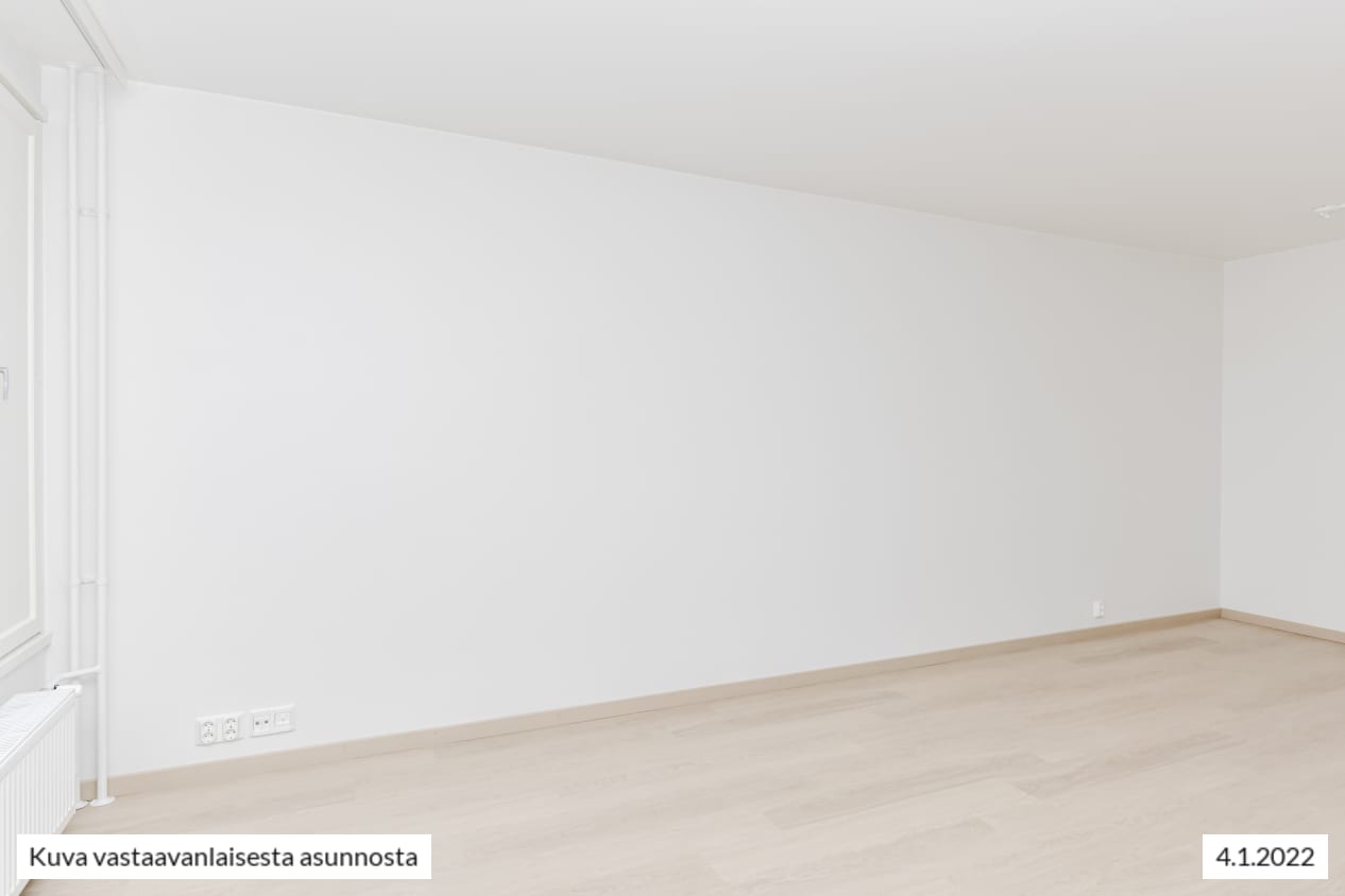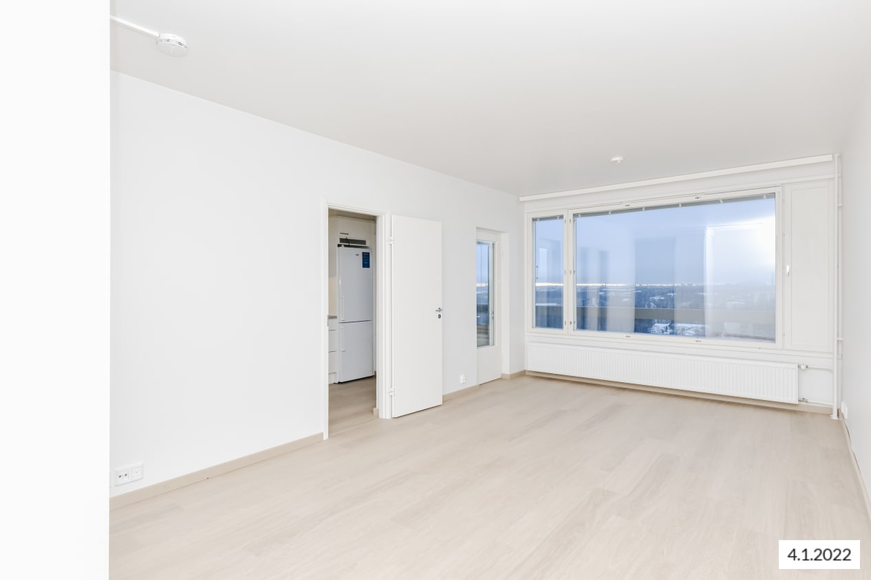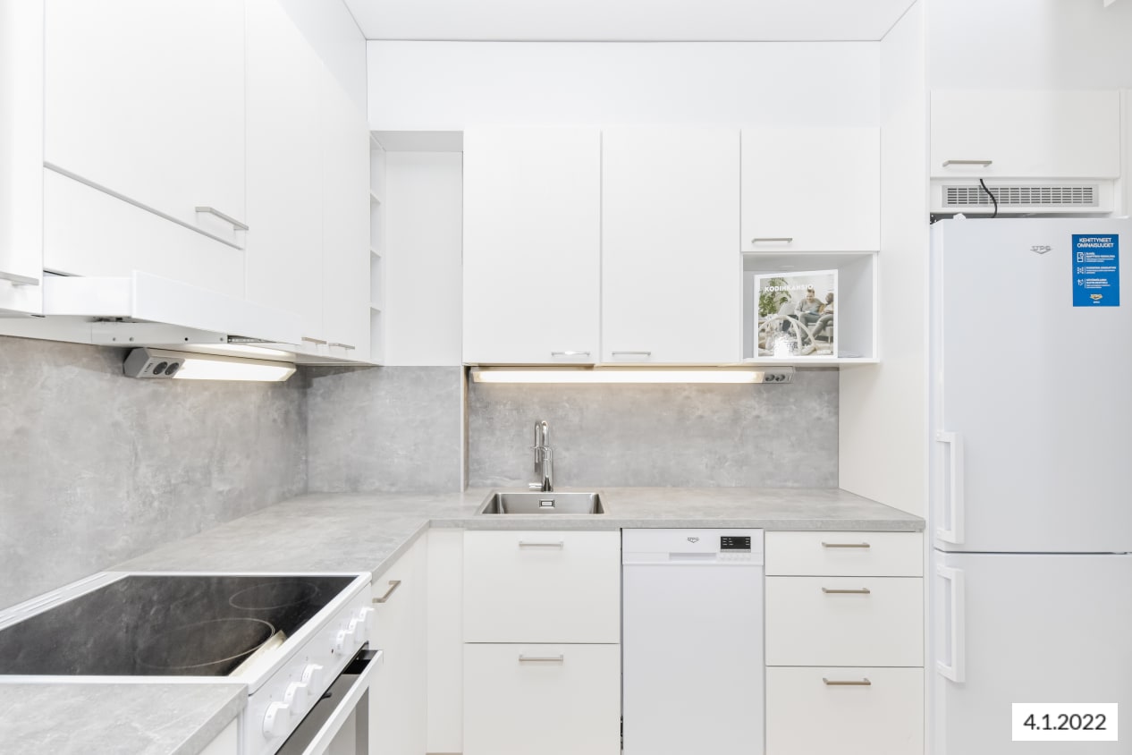 Remontoitu, selkeäpohjainen yksiö on helppo sisustaa itselleen mieluisaksi. Koko olohuoneen levyinen, matalalle laskeutuva ikkuna ja lasitettu parveke tuovat kotiin valoa ja avaruutta. Asunnon pintamateriaalit ovat vaaleita ja pelkistetyn yksinkertaisia. Lattia on vaaleaa tammilaminaattia ja seinät on maalattu valkoisiksi. Erillisessä keittiötilassa mahtuu kokkailemaan ja sinne sopii myös pieni ruokapöytä. Linjakkaat keittiökaapistot ovat valkoisia ja niiden pinta mukailee puun kuvioita. Ylä- ja alakaappien välinen tila ja työtaso ovat harmaata laminaattia. Varustukseen kuuluu keraaminen liesi, liesikupu, astianpesukone ja jääkaappipakastin. Kodinkoneet ovat valkoisia. Kylpyhuoneessa on valkoiset SATOn Kide-malliston kalusteet. Seinät ovat valkoista laattaa ja lattia on harmaa. Tilassa on varaus kapealle pyykinpesukoneelle.