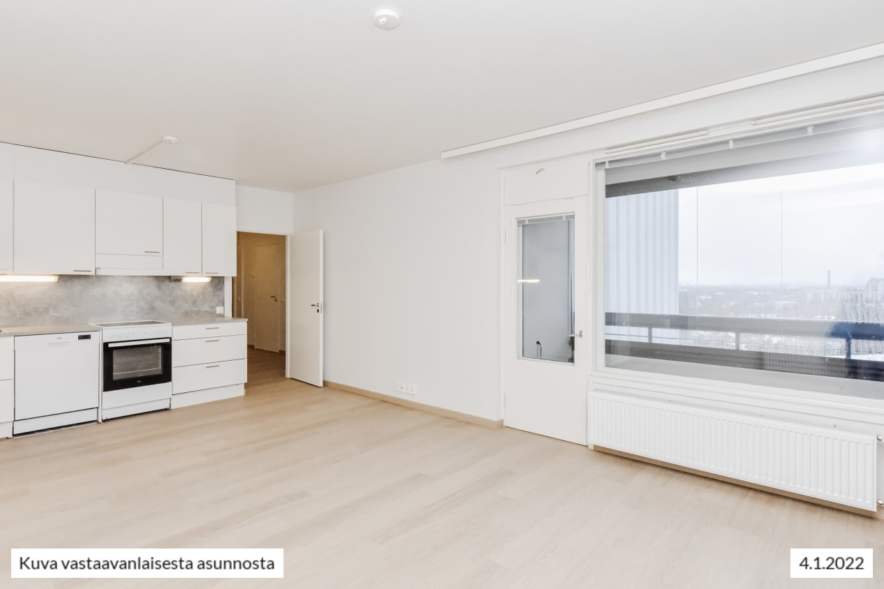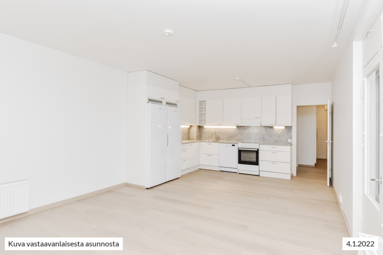 Remontoituun, valoisaan päätyasuntoon sisustat selkeän pohjaratkaisun ansiosta oman näköisesi kodin helposti. Tilava olohuone ja avoin keittiö muodostavat avaran oleskelualueen, joka jatkuu ilta-aurinkoon suuntautuvalle lasitetulle parvekkeelle. Pintamateriaalit ovat vaaleita ja pelkistetyn yksinkertaisia. Lattiat ovat vaaleaa tammilaminaattia ja seinät on maalattu valkoisiksi. Linjakkaat keittiönkaapistot ovat valkoiset ja niiden pinta mukailee puun kuvioita. Ylä- ja alakaappien välinen tila ja työtaso ovat harmaata laminaattia. Varustukseen kuuluu keraaminen liesi, liesikupu, astianpesukone ja korkea jääkaappi sekä pakastin. Kodinkoneet ovat valkoisia. Kylpyhuoneessa on valkoiset SATOn Kide-malliston kalusteet. Seinät ovat valkoista laattaa ja lattia on harmaa. Tilassa on varaus pesutornille. Makuuhuoneissa on mukavasti kaappitilaa vaatesäilytykselle.
