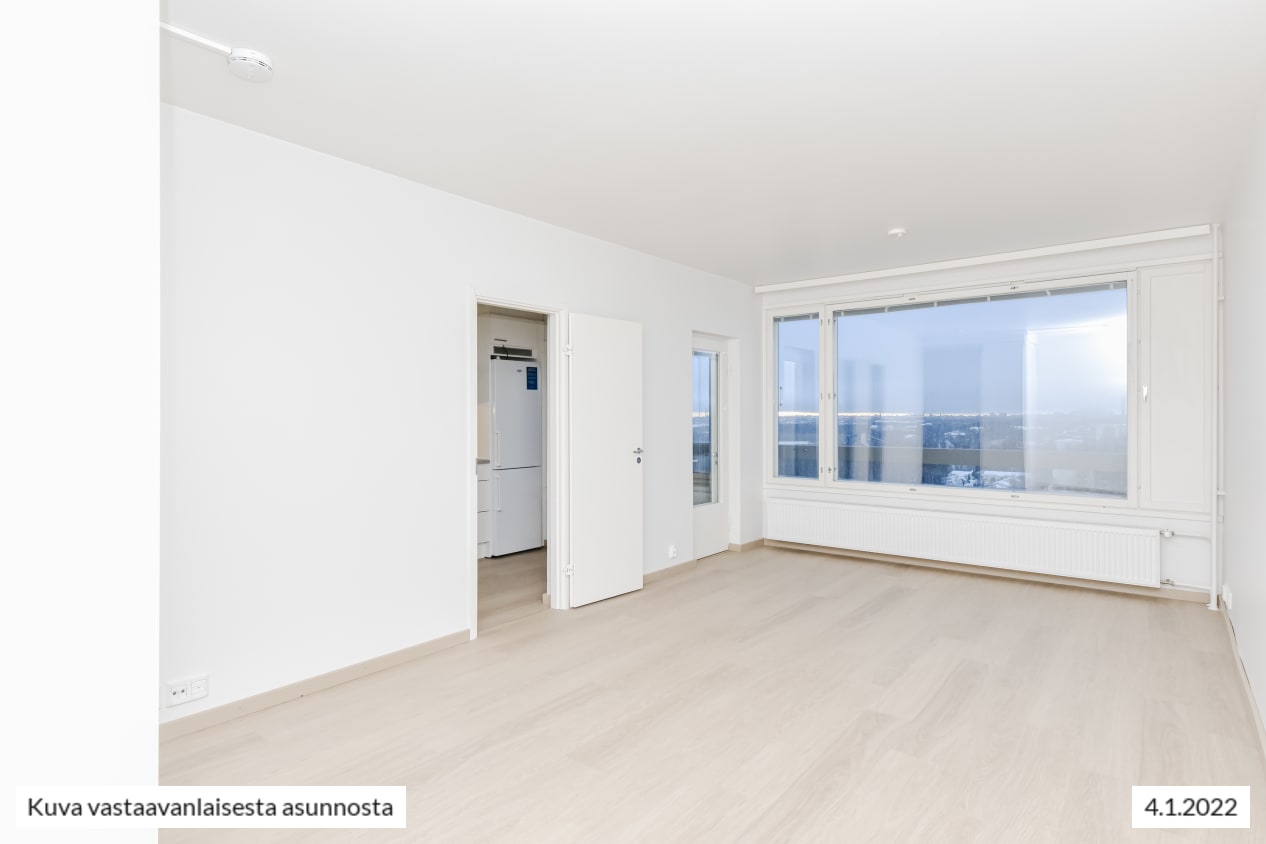 Remontoitu, selkeäpohjainen yksiö on helppo sisustaa itselleen mieluisaksi. Koko olohuoneen levyinen, matalalle laskeutuva ikkuna ja lasitettu parveke tuovat kotiin valoa ja avaruutta. Asunnon pintamateriaalit ovat vaaleita ja pelkistetyn yksinkertaisia. Lattia on vaaleaa tammilaminaattia ja seinät on maalattu valkoisiksi. Erillisessä keittiötilassa mahtuu kokkailemaan ja sinne sopii myös pieni ruokapöytä. Linjakkaat keittiökaapistot ovat valkoisia ja niiden pinta mukailee puun kuvioita. Ylä- ja alakaappien välinen tila ja työtaso ovat harmaata laminaattia. Varustukseen kuuluu keraaminen liesi, liesikupu, astianpesukone ja jääkaappipakastin. Kodinkoneet ovat valkoisia. Kylpyhuoneessa on valkoiset SATOn Kide-malliston kalusteet. Seinät ovat valkoista laattaa ja lattia on harmaa. Tilassa on varaus kapealle pyykinpesukoneelle.