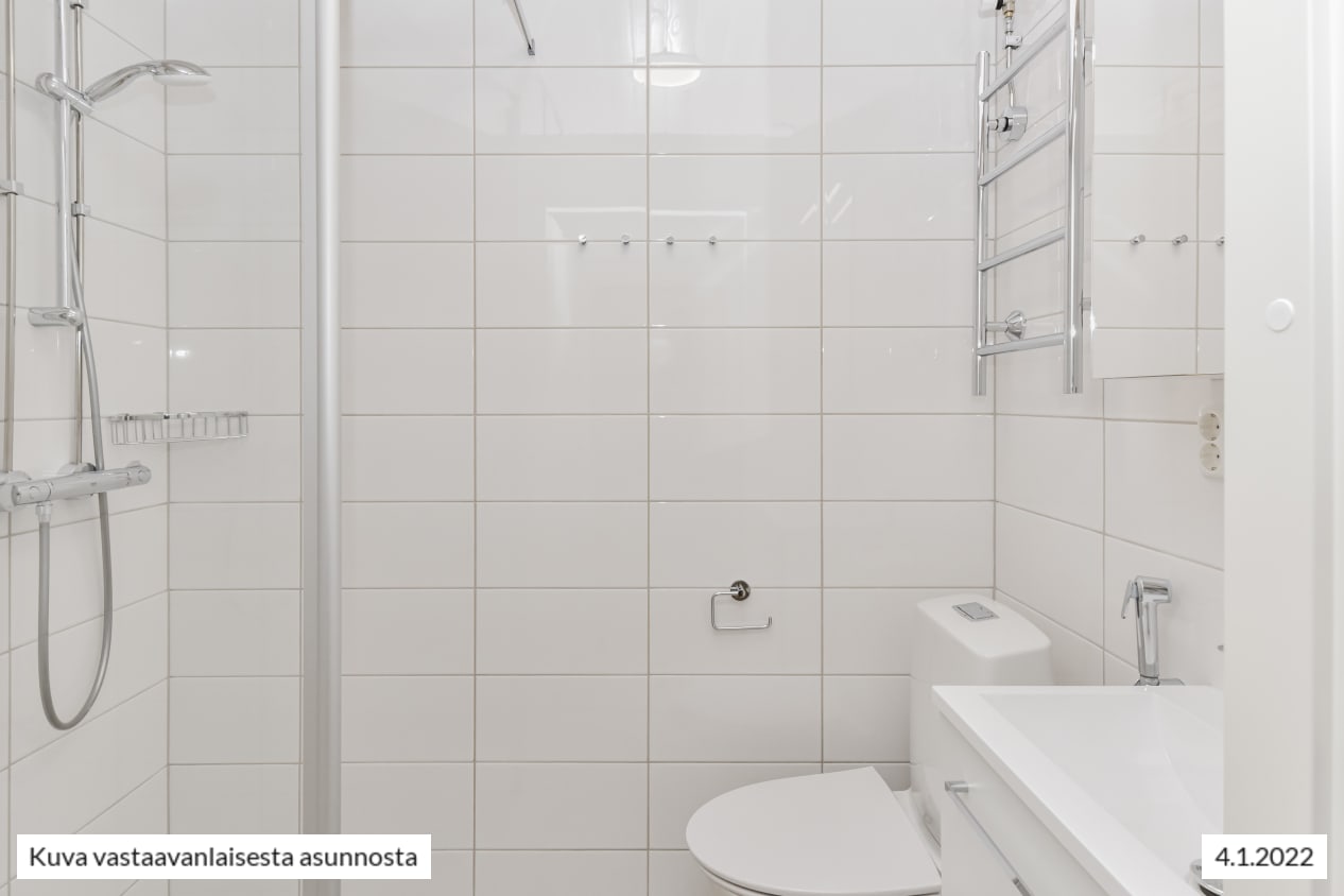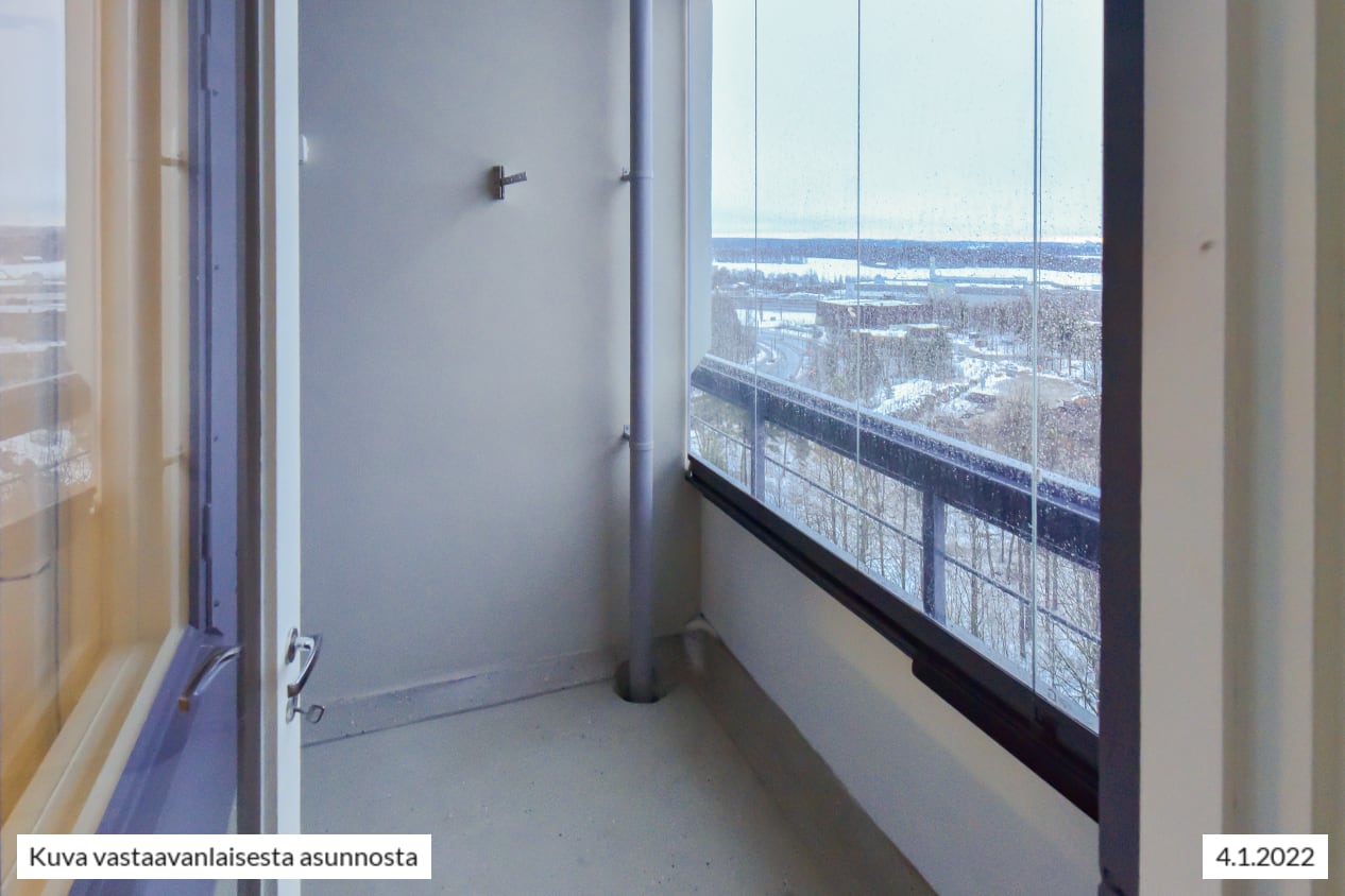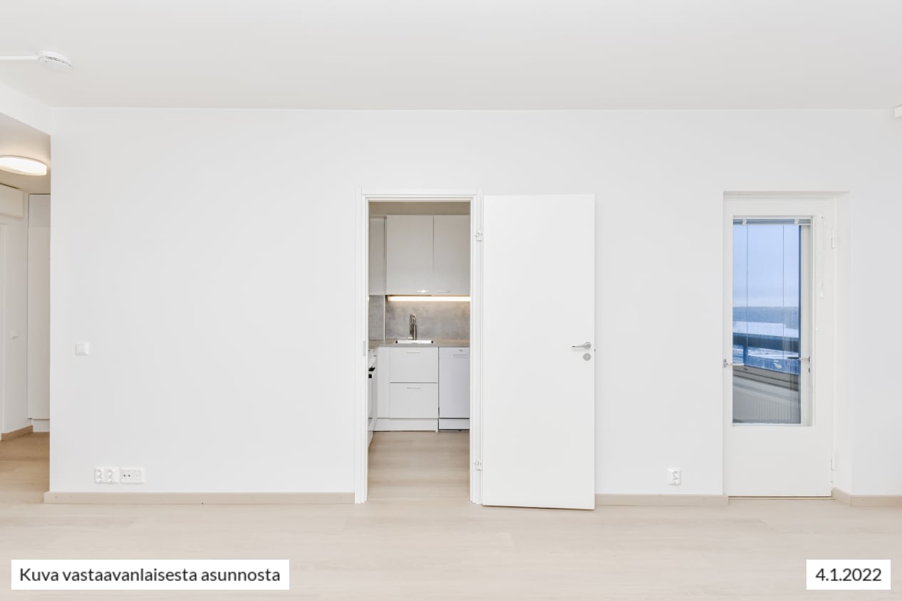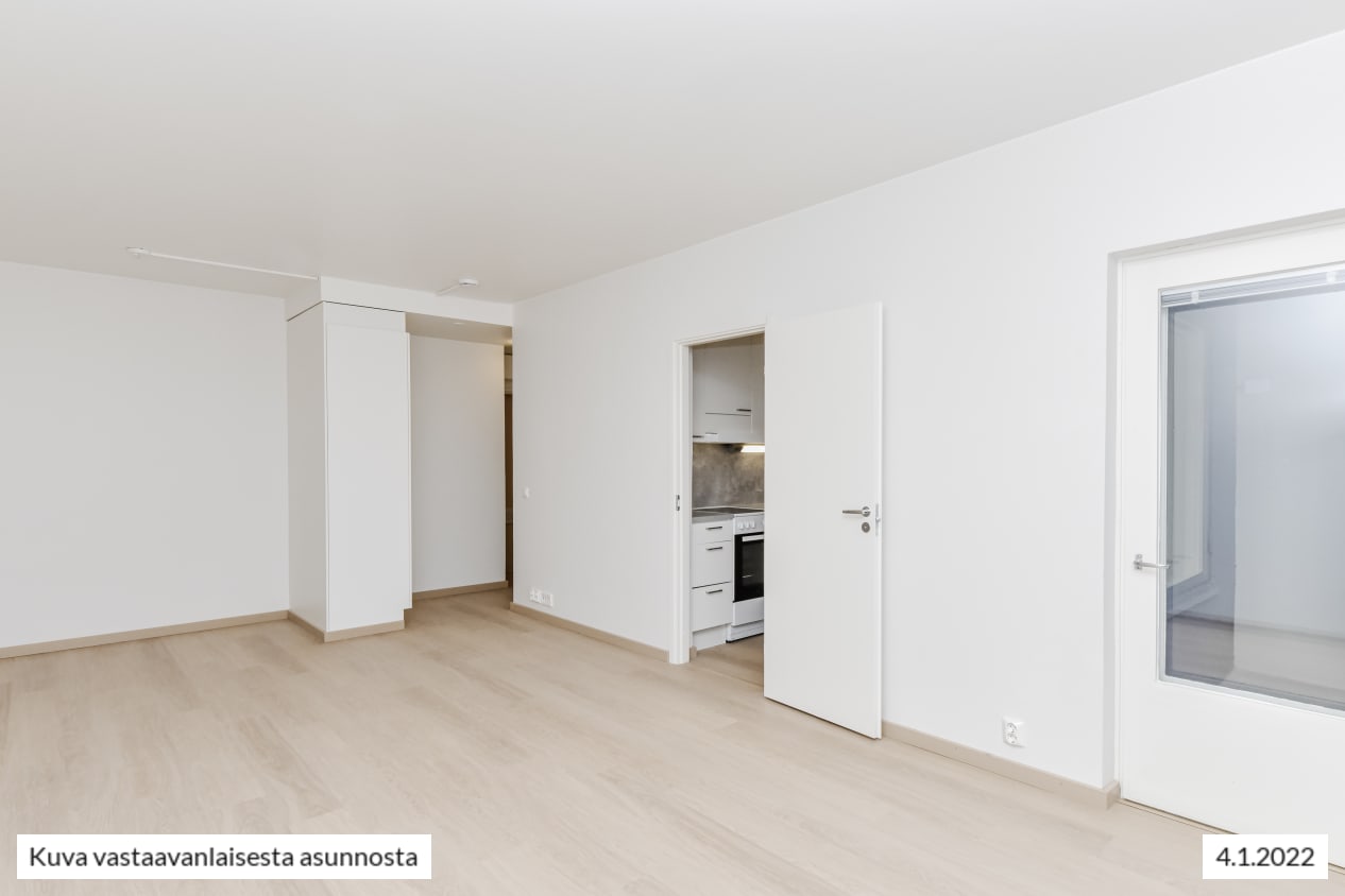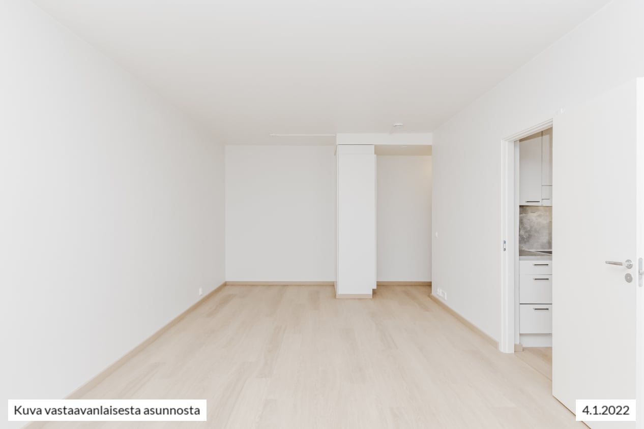 Remontoitu, selkeäpohjainen yksiö on helppo sisustaa itselleen mieluisaksi. Koko olohuoneen levyinen, matalalle laskeutuva ikkuna ja lasitettu parveke tuovat kotiin valoa ja avaruutta. Asunnon pintamateriaalit ovat vaaleita ja pelkistetyn yksinkertaisia. Lattia on vaaleaa tammilaminaattia ja seinät on maalattu valkoisiksi. Erillisessä keittiötilassa mahtuu kokkailemaan ja sinne sopii myös pieni ruokapöytä. Linjakkaat keittiökaapistot ovat valkoisia ja niiden pinta mukailee puun kuvioita. Ylä- ja alakaappien välinen tila ja työtaso ovat harmaata laminaattia. Varustukseen kuuluu keraaminen liesi, liesikupu, astianpesukone ja jääkaappipakastin. Kodinkoneet ovat valkoisia. Kylpyhuoneessa on valkoiset SATOn Kide-malliston kalusteet. Seinät ovat valkoista laattaa ja lattia on harmaa. Tilassa on varaus kapealle pyykinpesukoneelle.