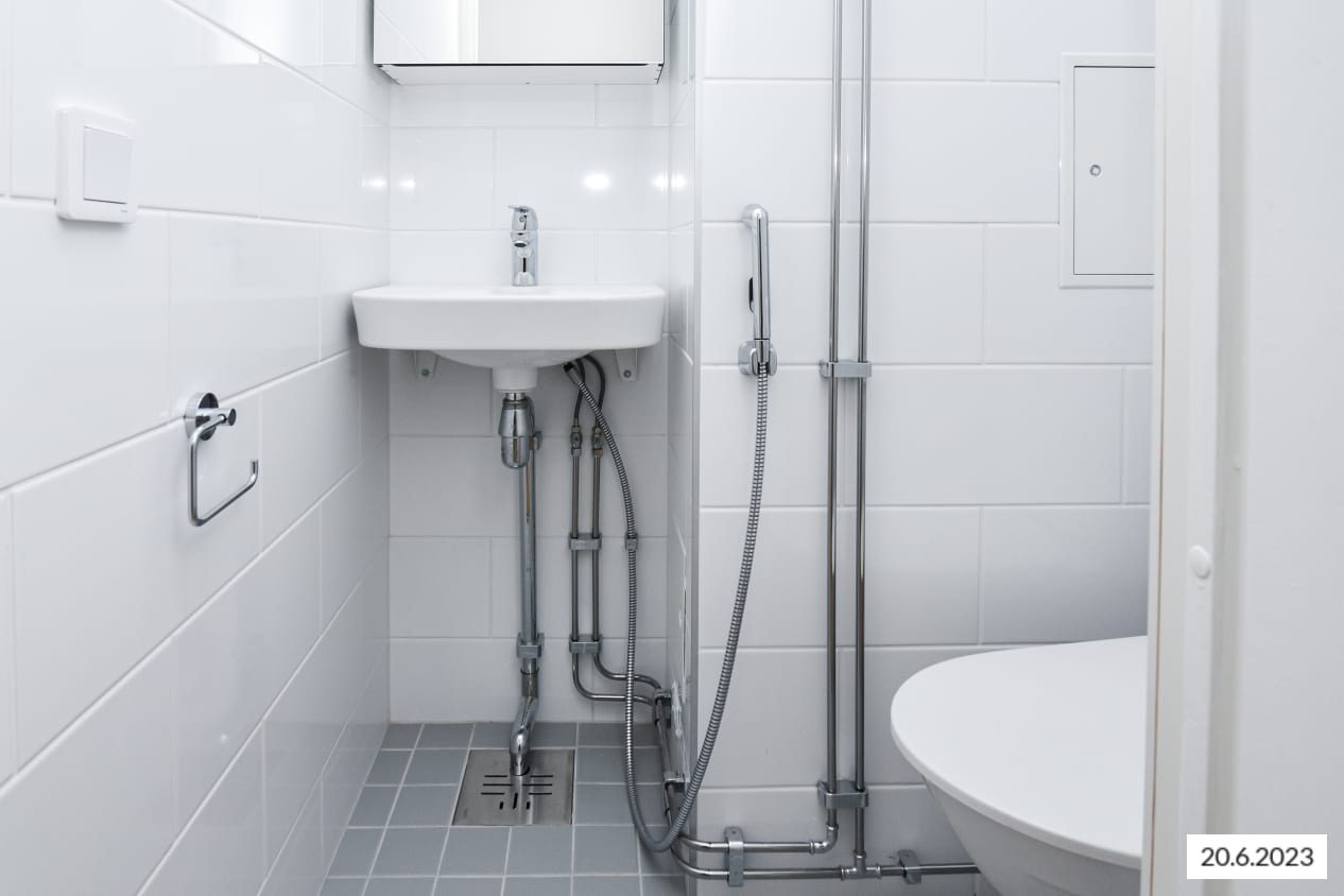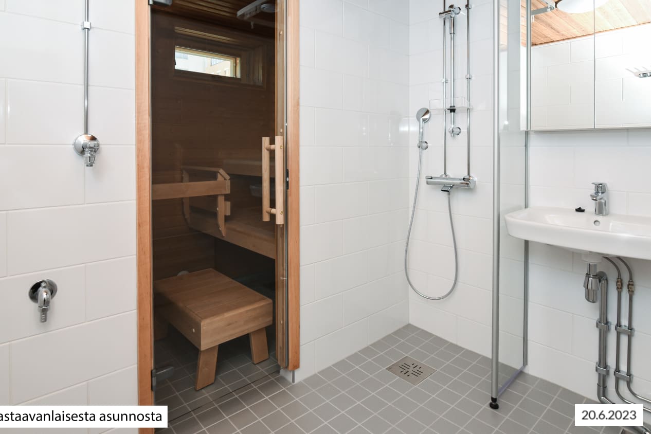 Asunnon kylpytilat on uusittu putkiremontin yhteydessä 2023: seinät ovat valkoista, tiililadottua laattaa, lattia vaalean harmaata pienempää laattaa ja kattopinnat lämpimänsävyistä puuta. Tasokkaasti remontoidussa kylpyhuoneessa on myös paikka ja liitännät pyykinpesukoneelle. Myös ikkunallisen saunan lattiassa on sama vaalean harmaa laatoitus.