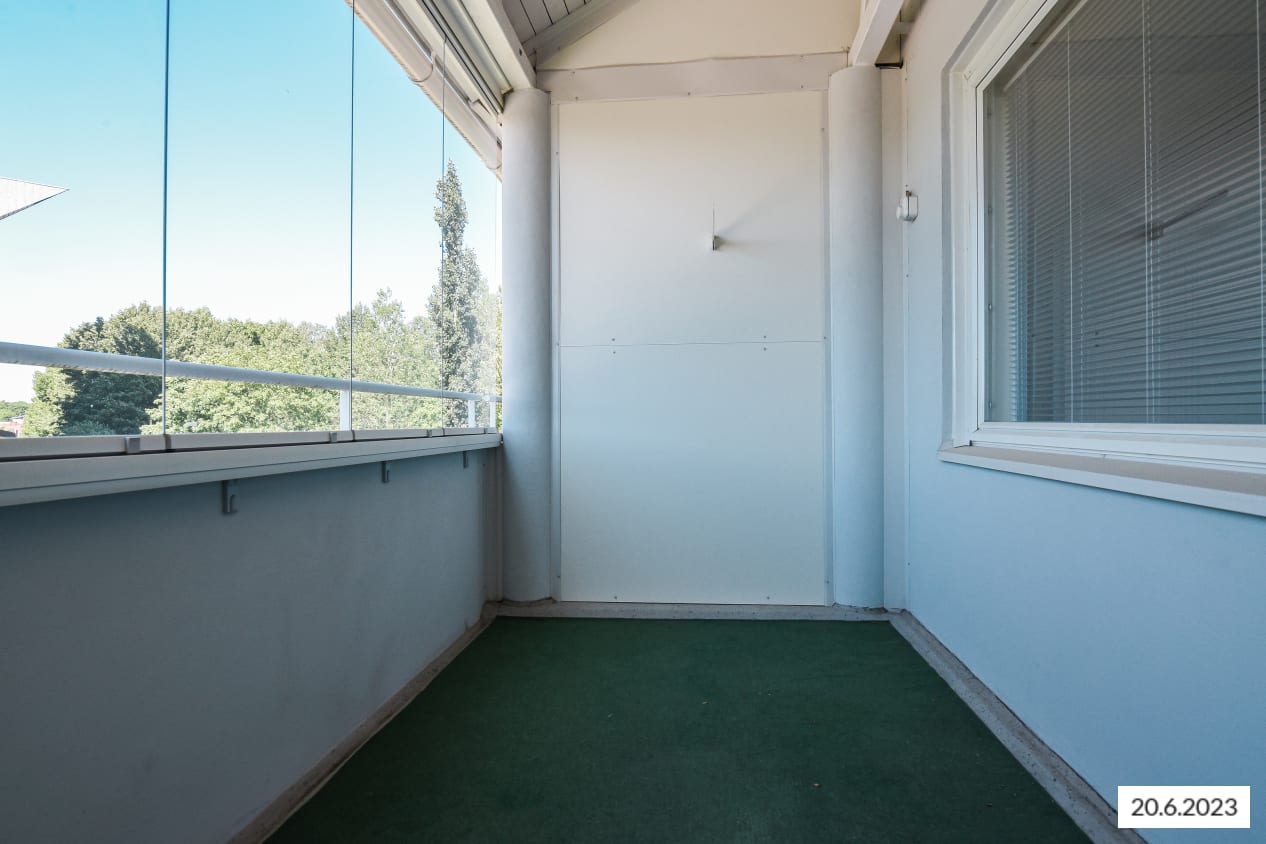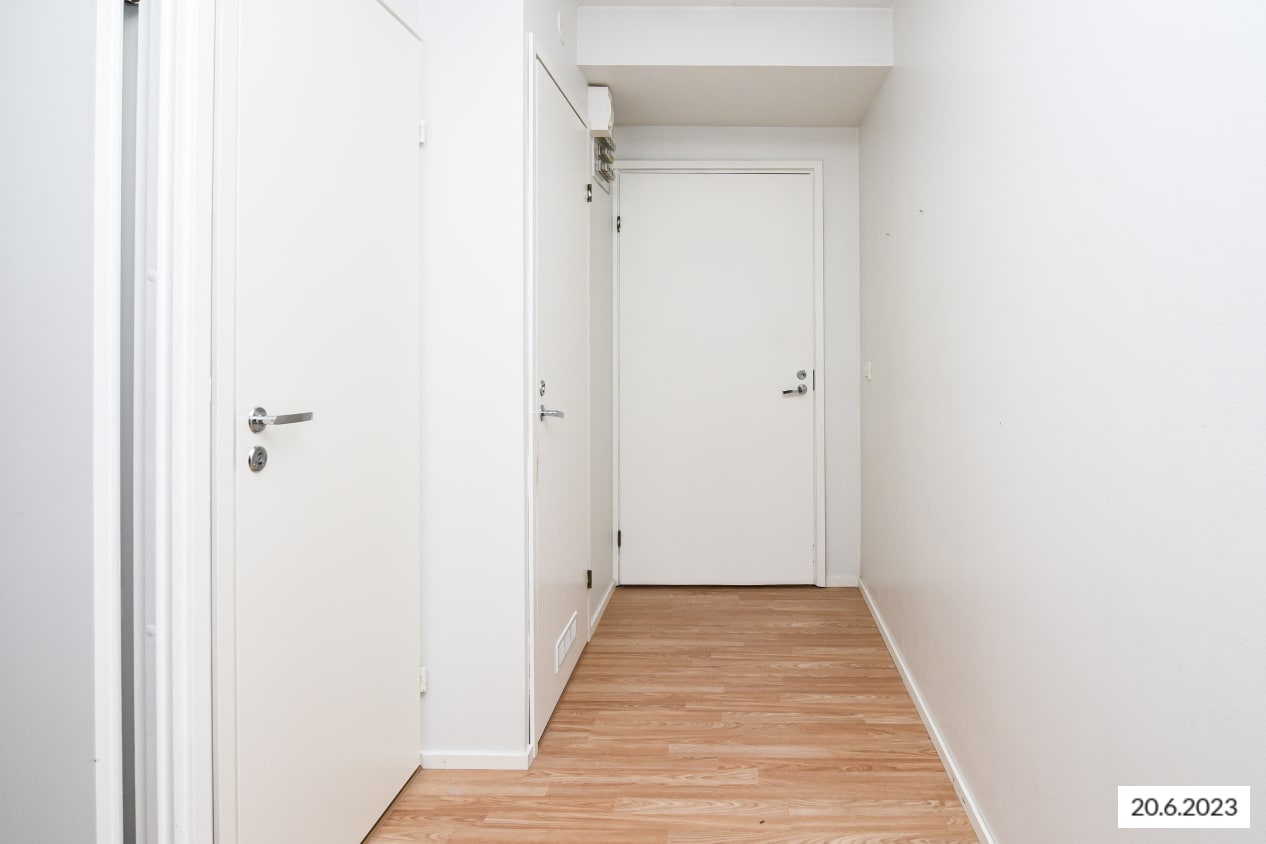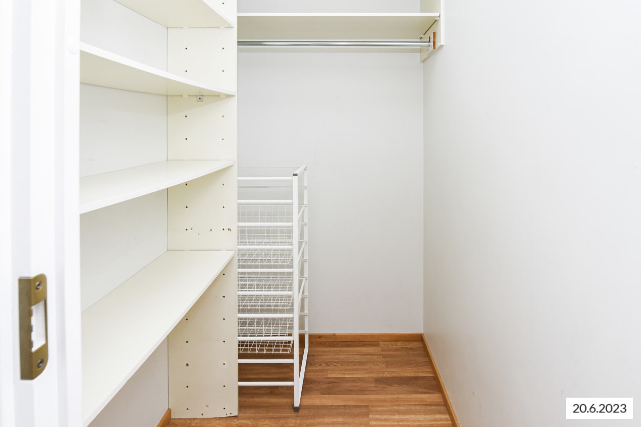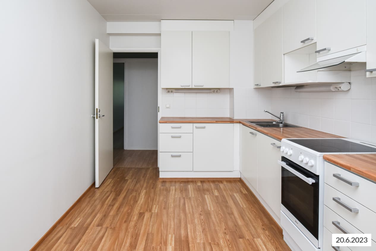 Kaikki tämän kodin pinnat ovat vaaleasävyisiä. Seinät on maalattu maalarinvalkoisella ja lattiassa on vaalea laminaatti. Nykyaikaiset keittiökaapistot ja makuuhuoneiden sekä eteisen komerot ovat valkoisia. Komeroiden lisäksi säilytystilaa löytyy vielä lisää erillisestä vaatehuoneesta. Keittiön varustukseen kuuluu jääkaappipakastin, nelilevyinen liesi sekä tilavaraus astianpesukoneelle ja mikroaaltouunille. Keittiön ikkunan ääreen sopii vähän suurempikin ruokapöytä.