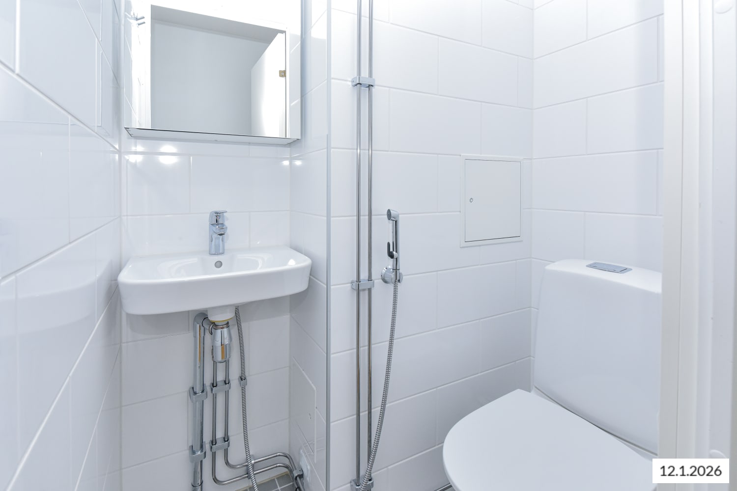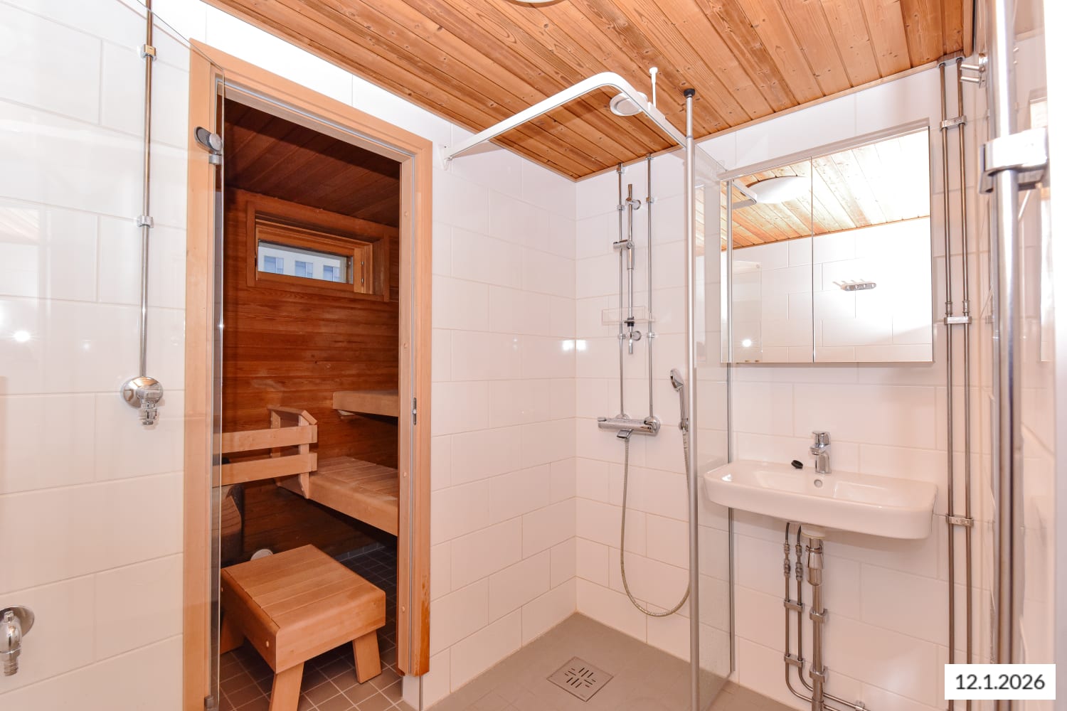 Asunnon kylpytilat on uusittu putkiremontin yhteydessä 2023: seinät ovat valkoista, tiililadottua laattaa, lattia vaalean harmaata pienempää laattaa ja kattopinnat lämpimänsävyistä puuta. Tasokkaasti remontoidussa kylpyhuoneessa on myös paikka ja liitännät pyykinpesukoneelle.