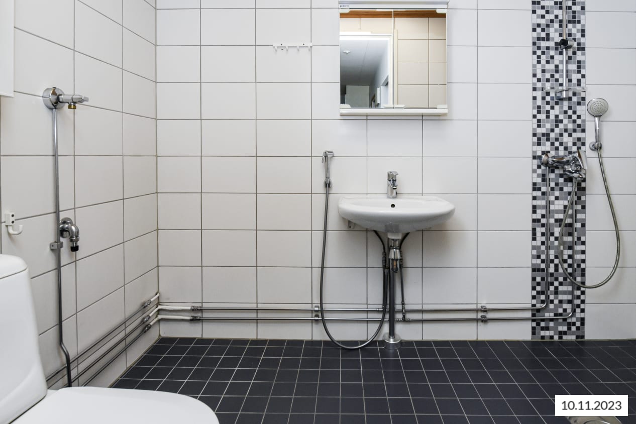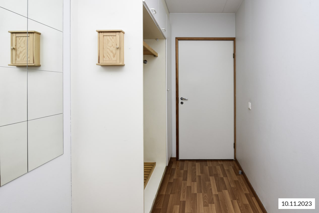 Asuinhuoneissa on tammilaminaattilattiat ja kylpyhuone on kaakeloitu. Keittiössä on jää-pakastinkaappi ja nelilevyinen sähköliesi.