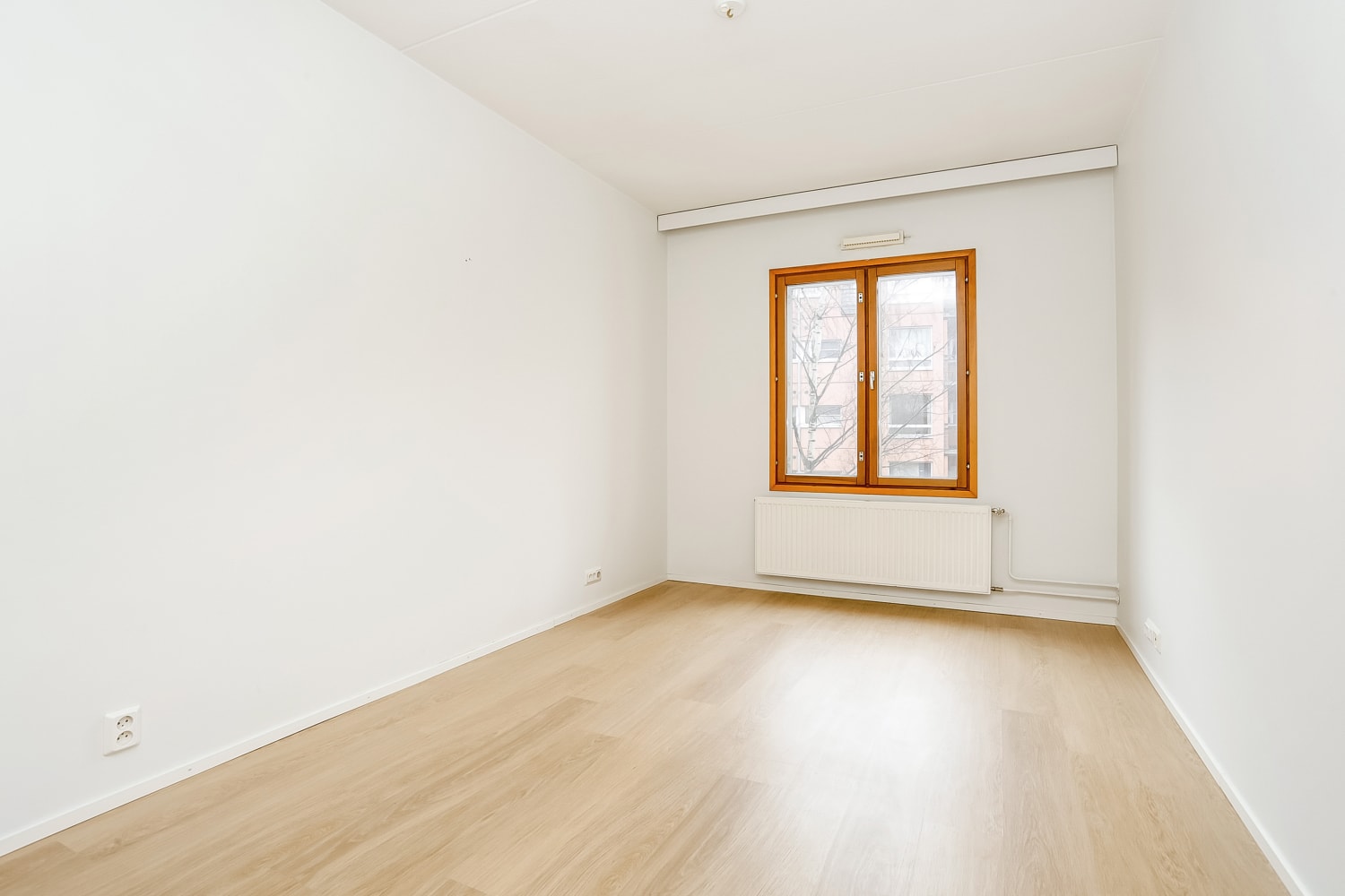 Tunnelmallisessa kaksiossa on siistit pintamateriaalit ja valoisat puitteet. Omalla parvekkeella saa nauttia ulkoilmasta ja vaikkapa aamukahvista kaikessa rauhassa. Lattiat ovat vaaleaa tammilaminaattia ja seinät on maalattu.