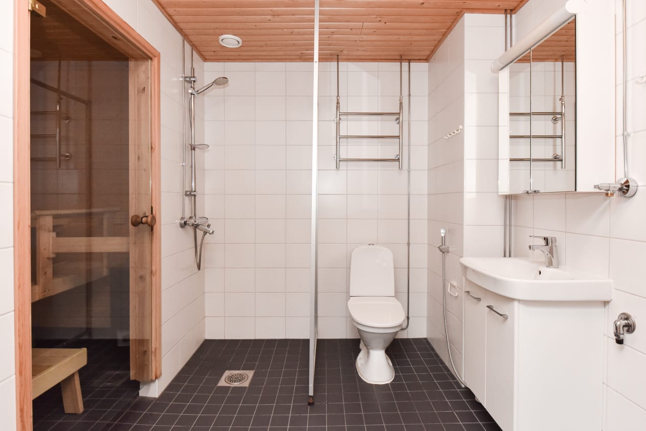 Asuinhuoneissa on pehmeän pähkinänsävyiset laminaattilattiat. Kylpyhuoneessa on mukavuuslattialämmitys, harmaa lattialaatoitus ja aavistuksen suorakaiteen muotoiset valkoiset seinäkaakelit. Sauna on kuusipaneloitu. Keittiössä on sileät valkoiset kaapistot, tyylikkään tummanharmaa laminaattityötaso ja kaunis vaalea köynnöskuvioinen kalustevälikaakelointi. Varusteina UPOn A-energialuokan valkoiset jää-pakastinkaappi, keraaminen liesi ja astianpesukone.
