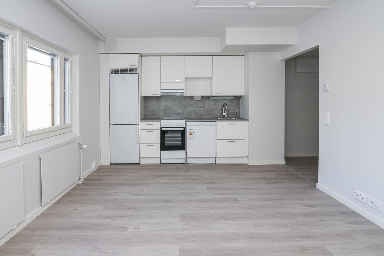 3/2021 peruskorjauksesta valmistuvan selkeälinjaisen kaksion keittiö ja olohuone yhdistyvät selkeäksi oleskelutilaksi, jonka sisustat helposti oman näköiseksi. Lattia on vaaleaa tammilaminaattia ja seinät on maalattu valkoisiksi. Keittiön kaapistot ovat raikkaan valkoiset ja ylä- ja alakaappien välinen tila sekä työtaso ovat harmaata laminaattia. Varustukseen kuuluu keraaminen liesi, liesikupu, jääkaappipakastin ja astianpesukone. Kodinkoneet ovat valkoisia. Makuuhuoneesta pääsee ilta-aurinkoon suuntautuvalle lasitetulle parvekkeelle. Kylpyhuoneessa on valkoiset SATOn Kide-malliston kalusteet. Seinät ovat valkoista laattaa ja lattia on harmaa. Pyykinpesukoneelle löytyy oma paikka. Tilavassa eteisessä on tavallista runsaammin komerotilaa.