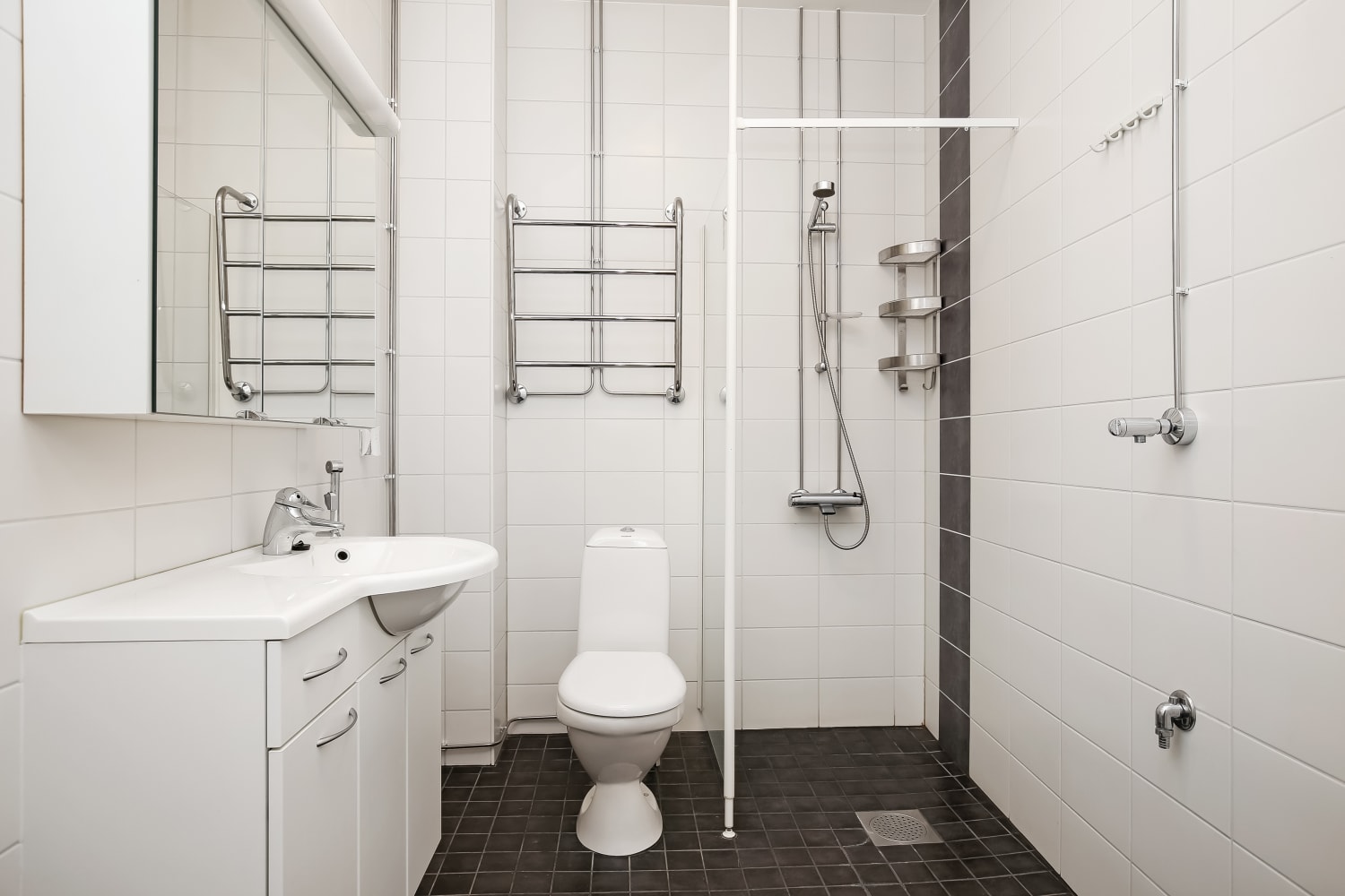 Koti korttelin keskellä. Skandinaavista vaaleutta, tilaa ja avaruutta - voiko kodilta enempää toivoa? 80-luvun kulmikkaaseen toimistotaloon tyylikkäällä otteella saneerattu vuokra-asunto vakuuttaa noin kolmeen metriin kohoavalla huonekorkeudellaan ja kattoa hipovilla ikkunoillaan vaativankin asunnon etsijän. Ikkunoista ja lasitetulta parvekkeelta avautuvat pihanäkymät pohjoiseen ja aamuaurinkoon. Asuinhuoneissa on helppohoitoiset tammilaminaattilattiat. Kylpyhuoneessa on pehmeän tummanharmaa lattialaatoitus ja seinissä pelkistetty valkoinen kaakelointi. Keittokomeron kaapistot ovat sileäpintaiset ja valkoiset, työtasot valkoista taivereunaista laminaattia ja puhtaan ilmeen täydentää valkoinen kiiltävä kalustevälikaakelointi. Varusteina jää-pakastinkaappi, keraaminen liesi sekä kalusteisiin integroitu astianpesukone.
