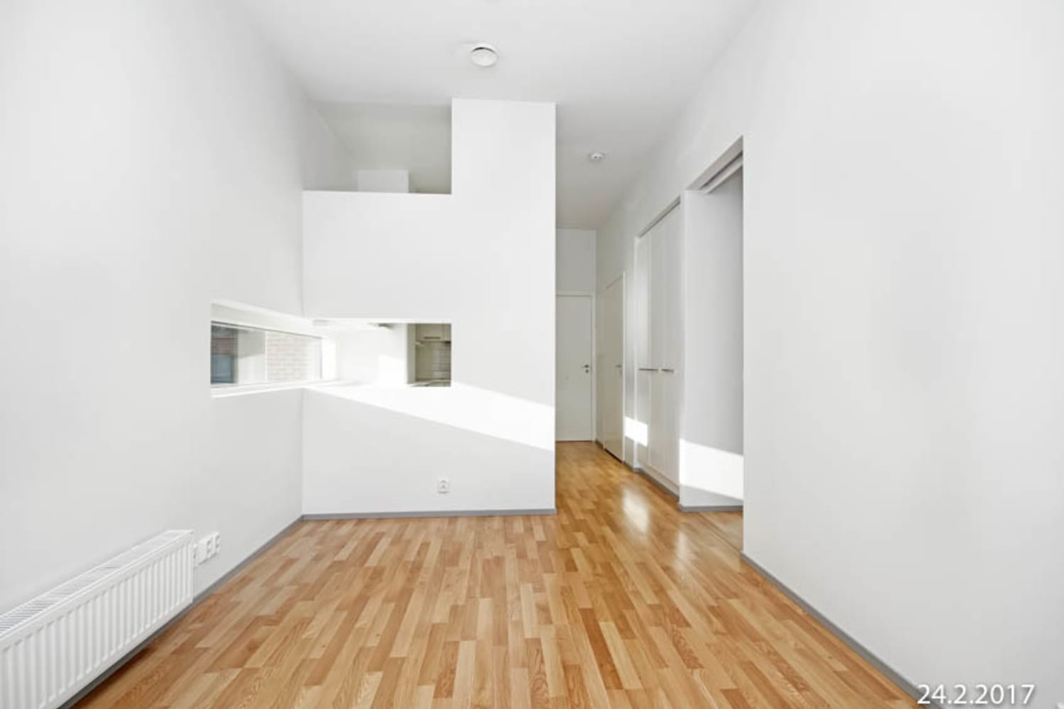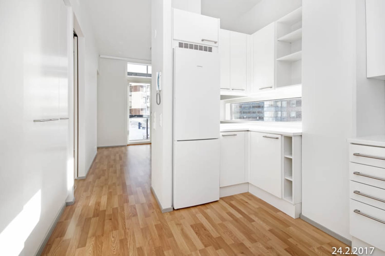 Koti korttelin keskellä. Etsitkö pienempää vuokra-asuntoa, jossa olisi kuitenkin erillinen makuuhuone? Kompaktia kotia, jossa olisi kuitenkin avaruutta ja ilmavuutta? Tämä tyylikäs pikkukaksio vastaa toiveisiisi noin kolmeen metriin nousevalla huonekorkeudellaan ja toimivalla pohjaratkaisullaan. Keittokomeroon tulvii luonnonvaloa leveastä mutta matalasta ikkunasta, lasitetulta parvekkeelta avautuu näkymä pihalle ja korttelitorille. Asuinhuoneissa on helppohoitoiset tammilaminaattilattiat. Kylpyhuoneessa on pehmeän tummanharmaa lattialaatoitus ja seinissä pelkistetty valkoinen kaakelointi. Keittokomeron kaapistot ovat sileäpintaiset ja valkoiset, työtasot valkoista taivereunaista laminaattia ja puhtaan ilmeen täydentää valkoinen kiiltävä kalustevälikaakelointi. Varusteina jää-pakastinkaappi, keraaminen liesi sekä kalusteisiin integroitu astianpesukone.