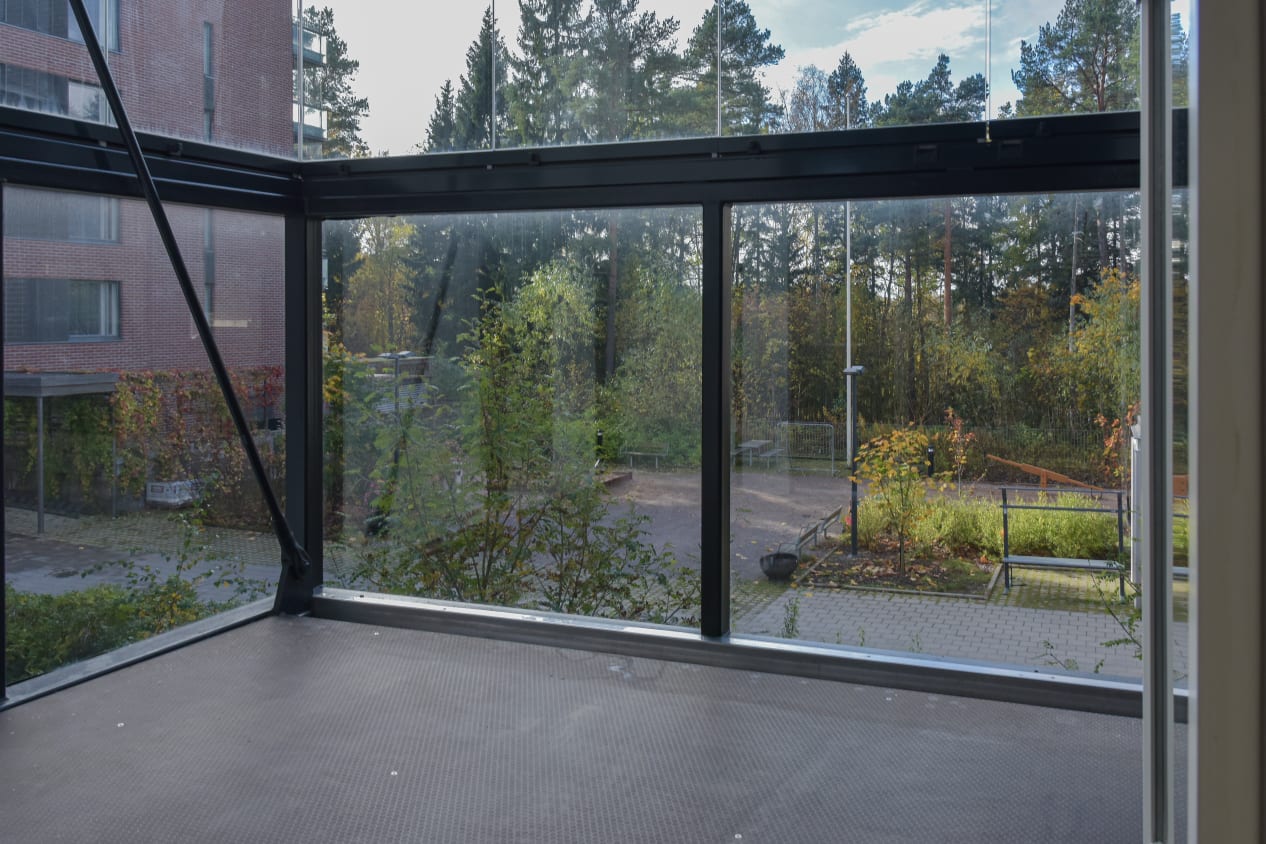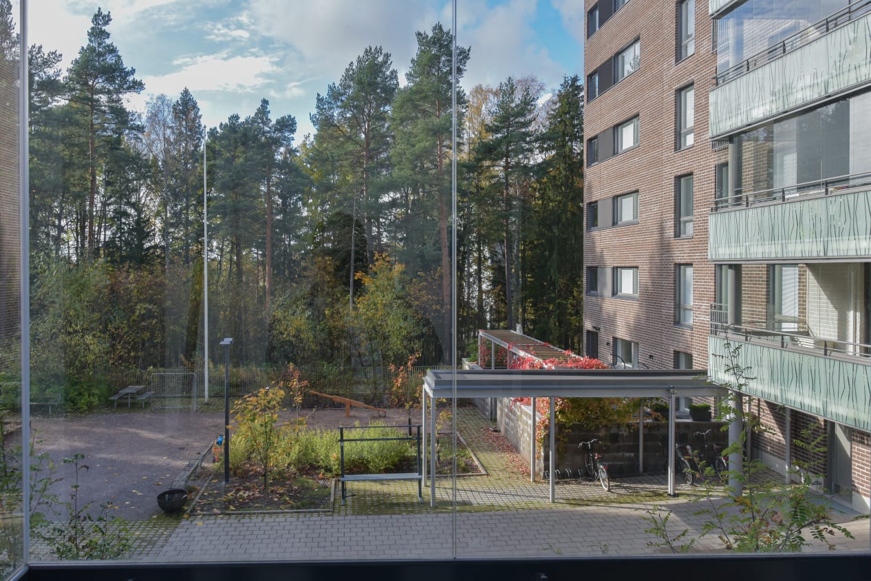 Noin kolmeen metriin kohoava katto korostuu korkeiden ikkunoiden ansiosta, hyvin varusteltu keittokomero viehättää valkoisilla pinnoillaan ja lasitettu parveke avautuu ilta-aurinkoon pihan (ja puiston) puolelle. Asuinhuoneissa on helppohoitoiset tammilaminaattilattiat.