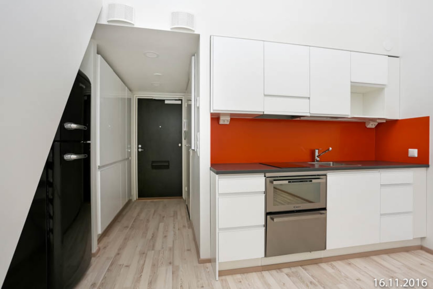 Modernin pikkukodin keittiö ja olohuone yhdistyvät viihtyisäksi oleskelutilaksi, jossa katto on korkealla ja valo tulvii sisään isoista ikkunoista. Tilavalla parvella mahtuu seisomaan ja sinne voi järjestää nukkumapaikan lisäksi rauhallisen sopen, vaikka työtilaksi tai lukunurkaksi. Asuintilojen lattiat ovat saarnen sävyistä laminaattia. Keittiön kaapistojen ovet ovat raikkaan valkoiset ja ylä- ja alakaappien välisessä tilassa on mausteisen oranssi verhoilulevy. Työtaso on tummaa laminaattia. Varustukseen kuuluu keraaminen liesi, astianpesukone, jääkaappipakastin sekä varaus mikroaaltouunille. Kokonaan laatoitettujen kylpyhuoneiden seinät ovat kiiltävän valkoiset ja lattioissa on punavalkoinen shakkiruutukuvioinen laatoitus. Pesukoneelle on tilavaraus.