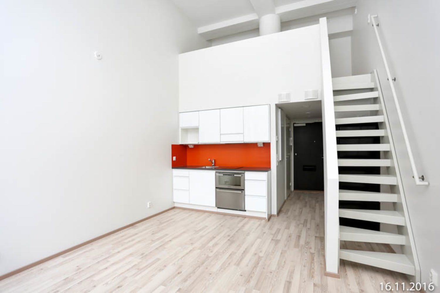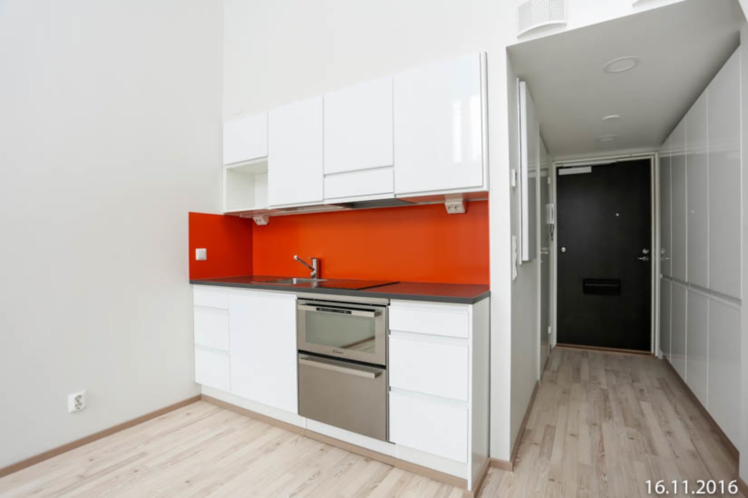 Asuintilojen lattiat ovat saarnen sävyistä laminaattia. Keittiön kaapistojen ovet ovat raikkaan valkoiset ja ylä- ja alakaappien välisessä tilassa on mausteisen oranssi verhoilulevy. Työtaso on tummaa laminaattia. Varustukseen kuuluu keraaminen liesi, astianpesukone, jääkaappipakastin sekä varaus mikroaaltouunille. Kokonaan laatoitettujen kylpyhuoneiden seinät ovat kiiltävän valkoiset ja lattioissa on punavalkoinen shakkiruutukuvioinen laatoitus. Pesukoneelle on tilavaraus.