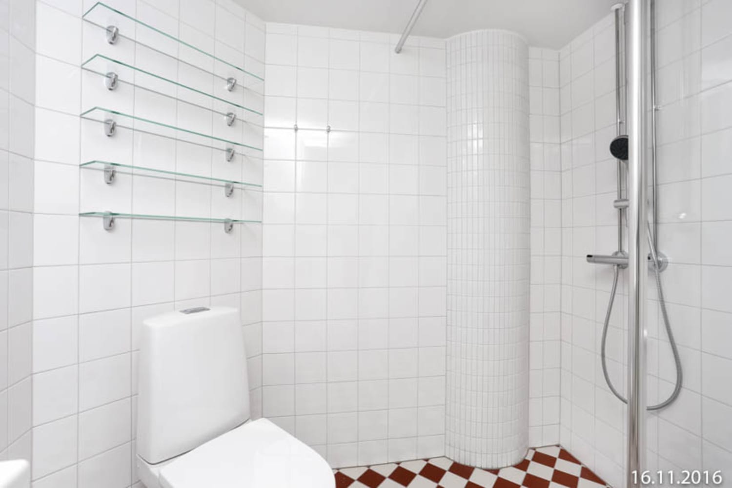 Asuintilojen lattiat ovat saarnen sävyistä laminaattia. Keittiön kaapistojen ovet ovat raikkaan valkoiset ja ylä- ja alakaappien välisessä tilassa on mausteisen oranssi verhoilulevy. Työtaso on tummaa laminaattia. Varustukseen kuuluu keraaminen liesi, astianpesukone, jääkaappipakastin sekä varaus mikroaaltouunille. Kokonaan laatoitettujen kylpyhuoneiden seinät ovat kiiltävän valkoiset ja lattioissa on punavalkoinen shakkiruutukuvioinen laatoitus. Pesukoneelle on tilavaraus.
