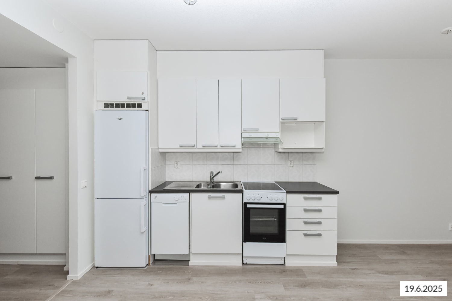 Varusteina UPOn A-energialuokan valkoiset jää-pakastinkaappi, keraaminen liesi ja astianpesukone.